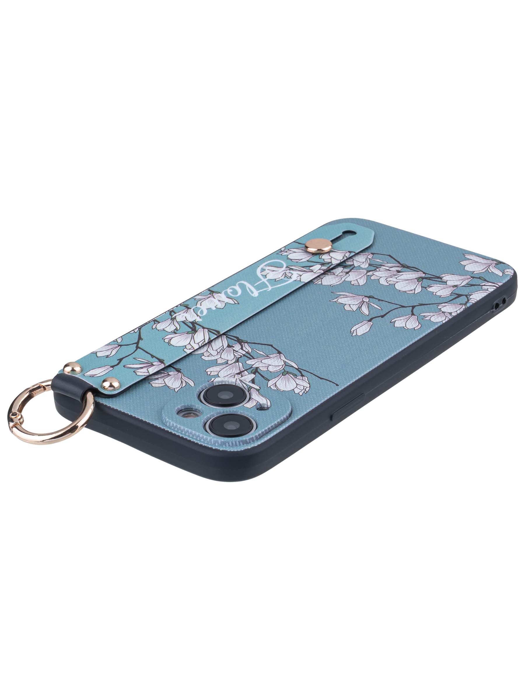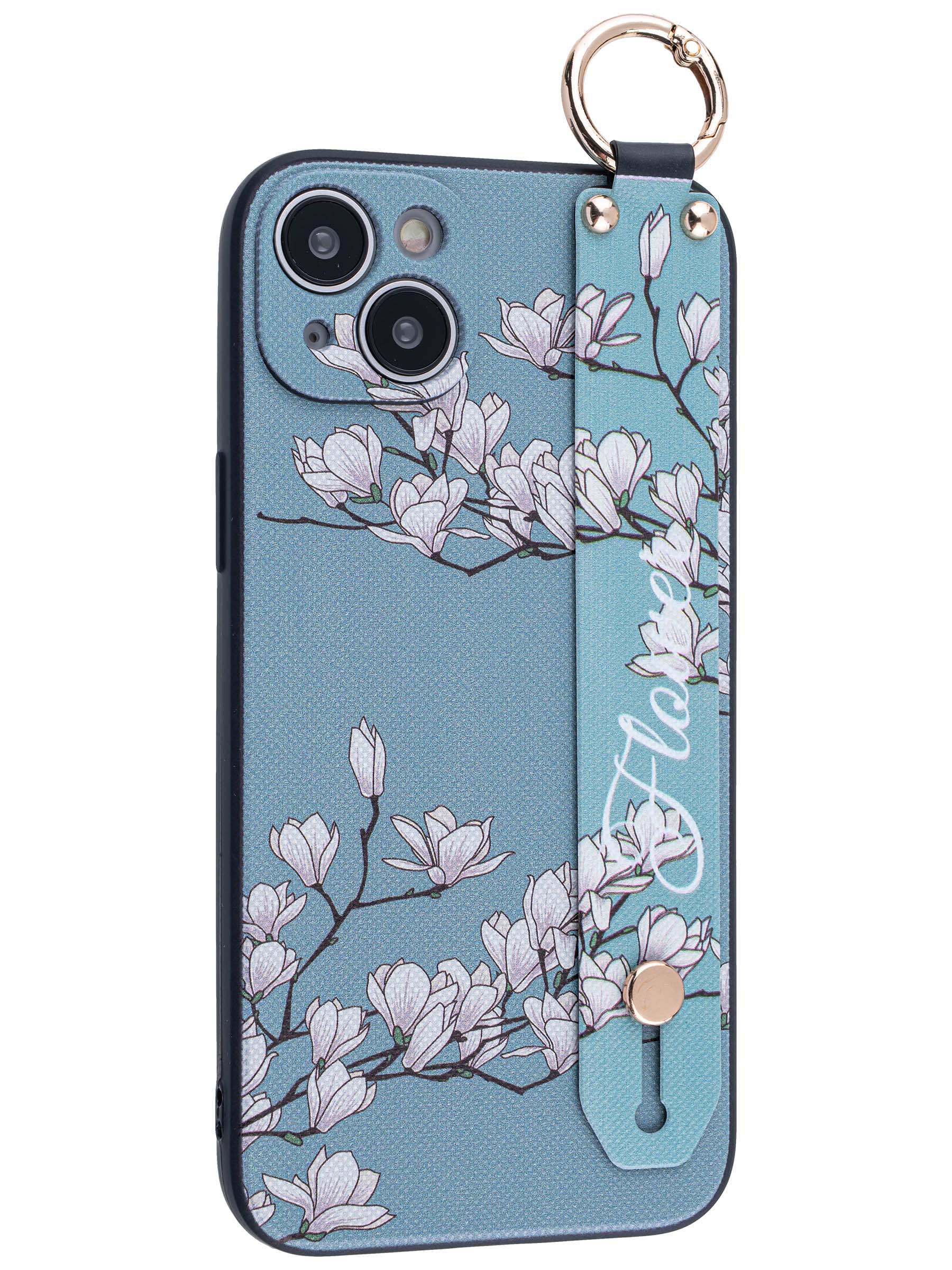 Силиконовый чехол Flower для iPhone 14 Plus / 15 Plus Цветение магнолии (с ручкой) голубой