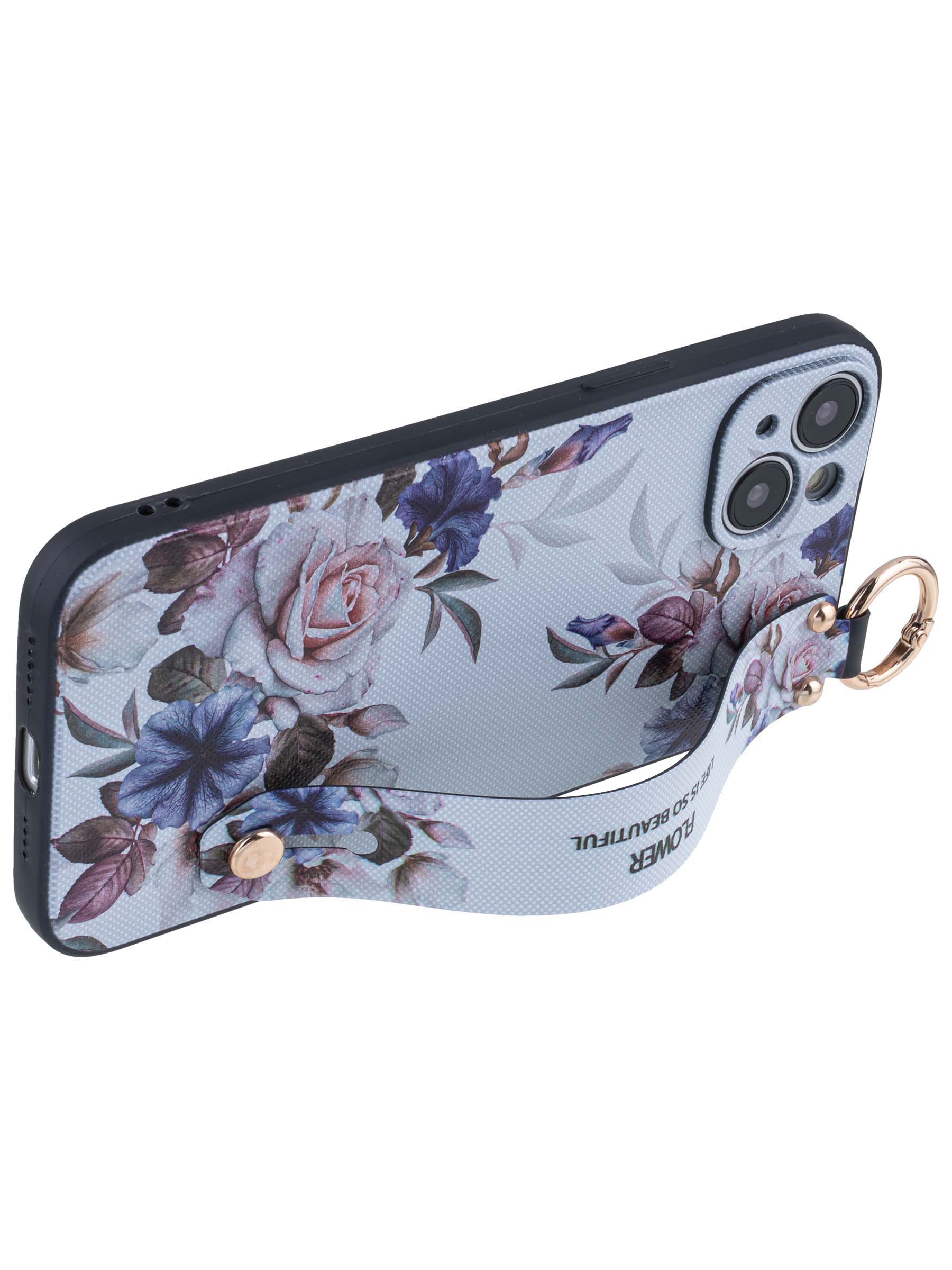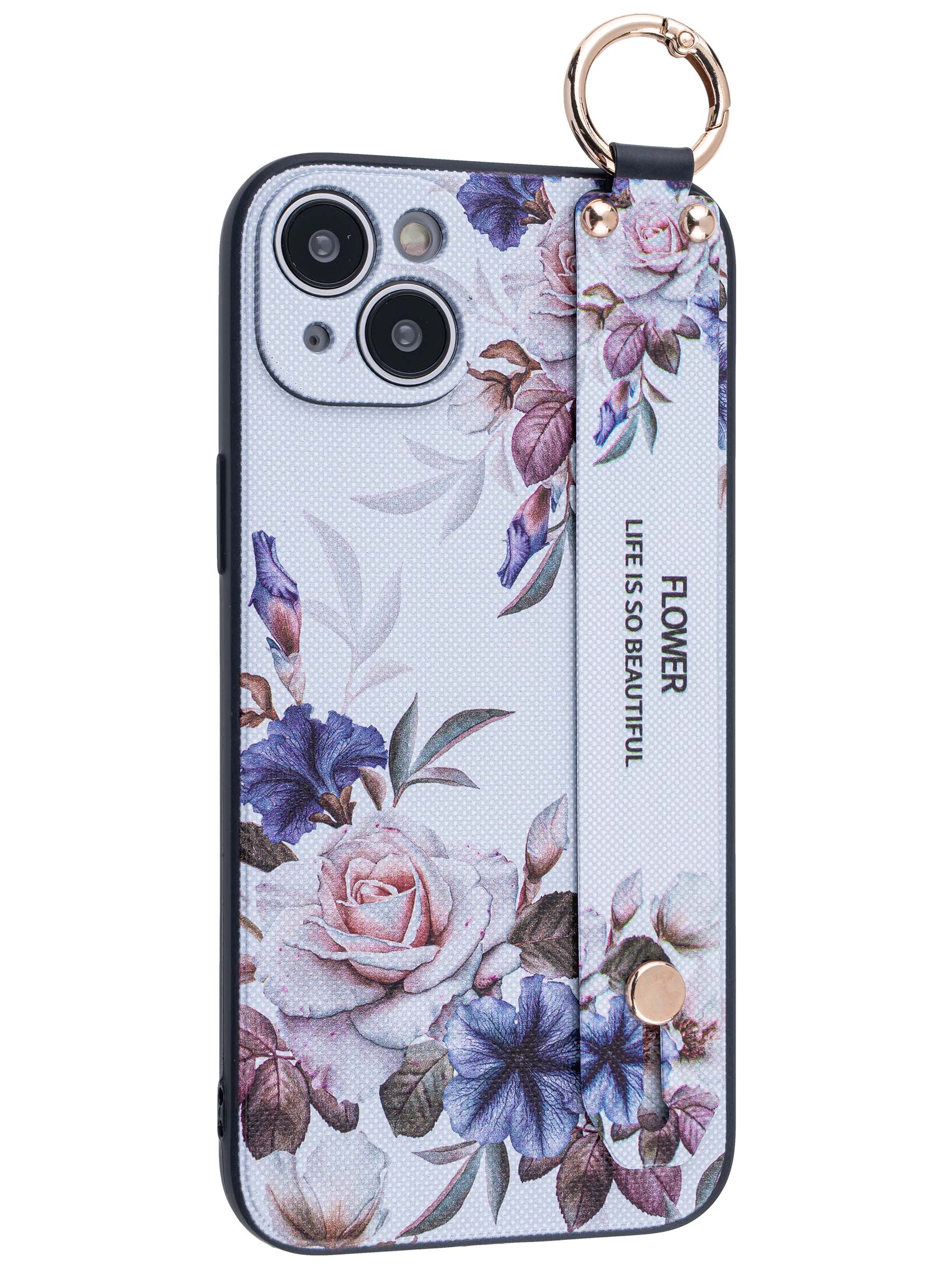 Силиконовый чехол Flower для iPhone 14 Plus / 15 Plus Цветущая роза (с ручкой) белый