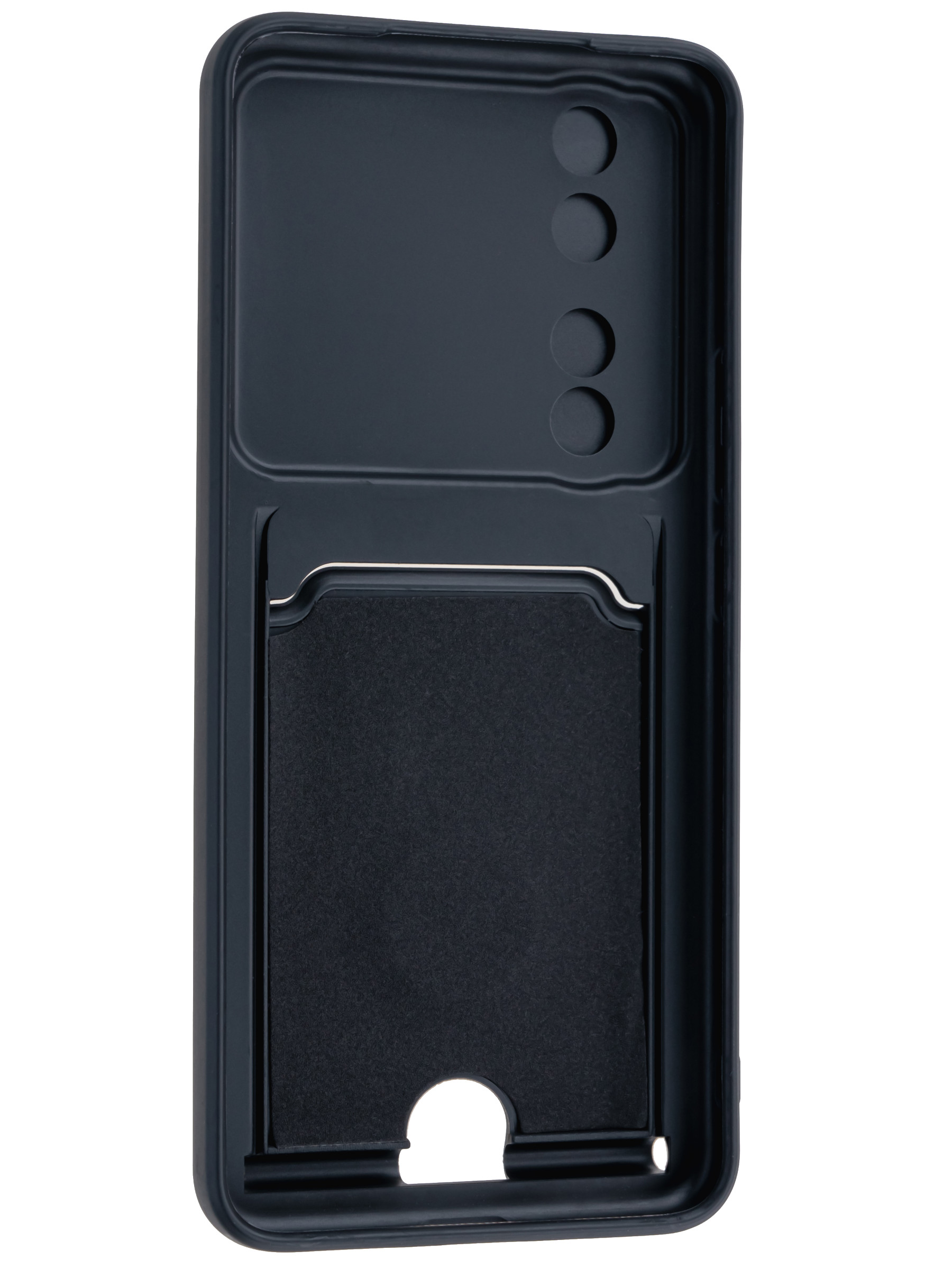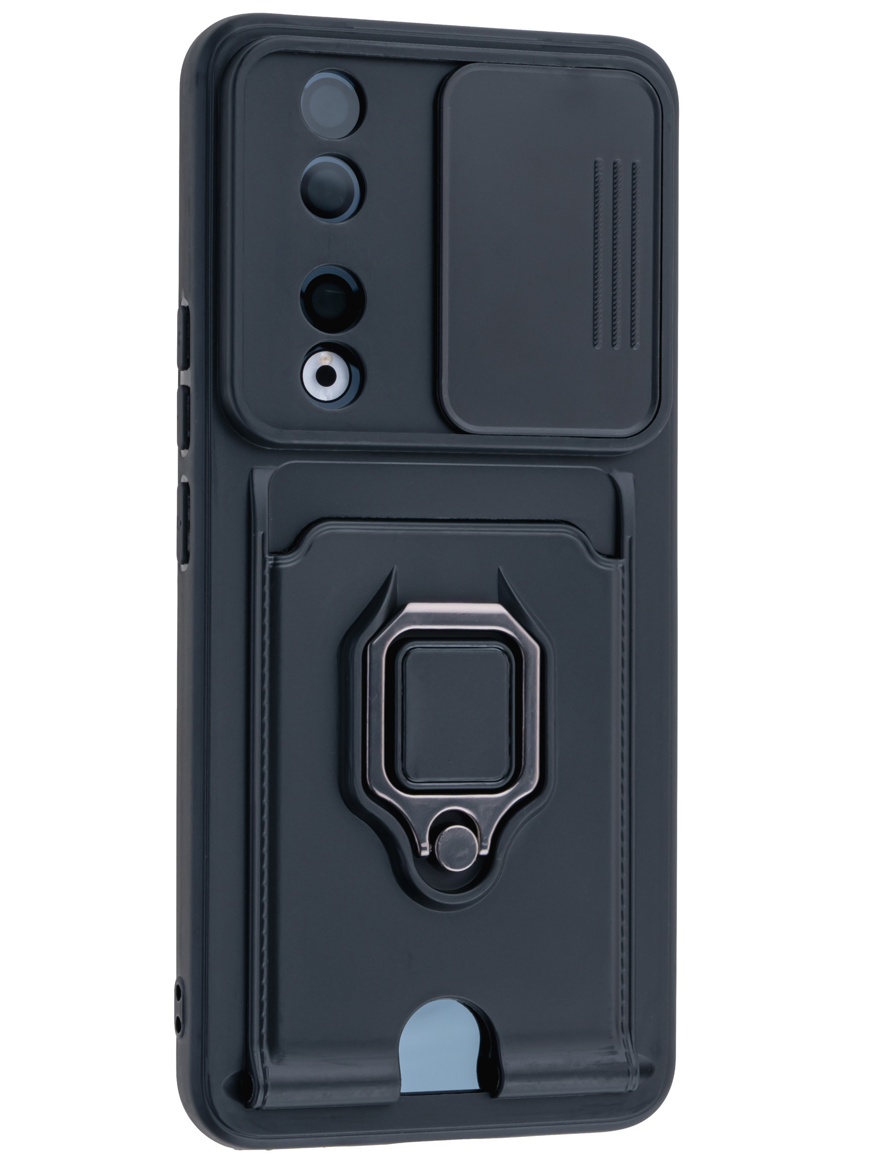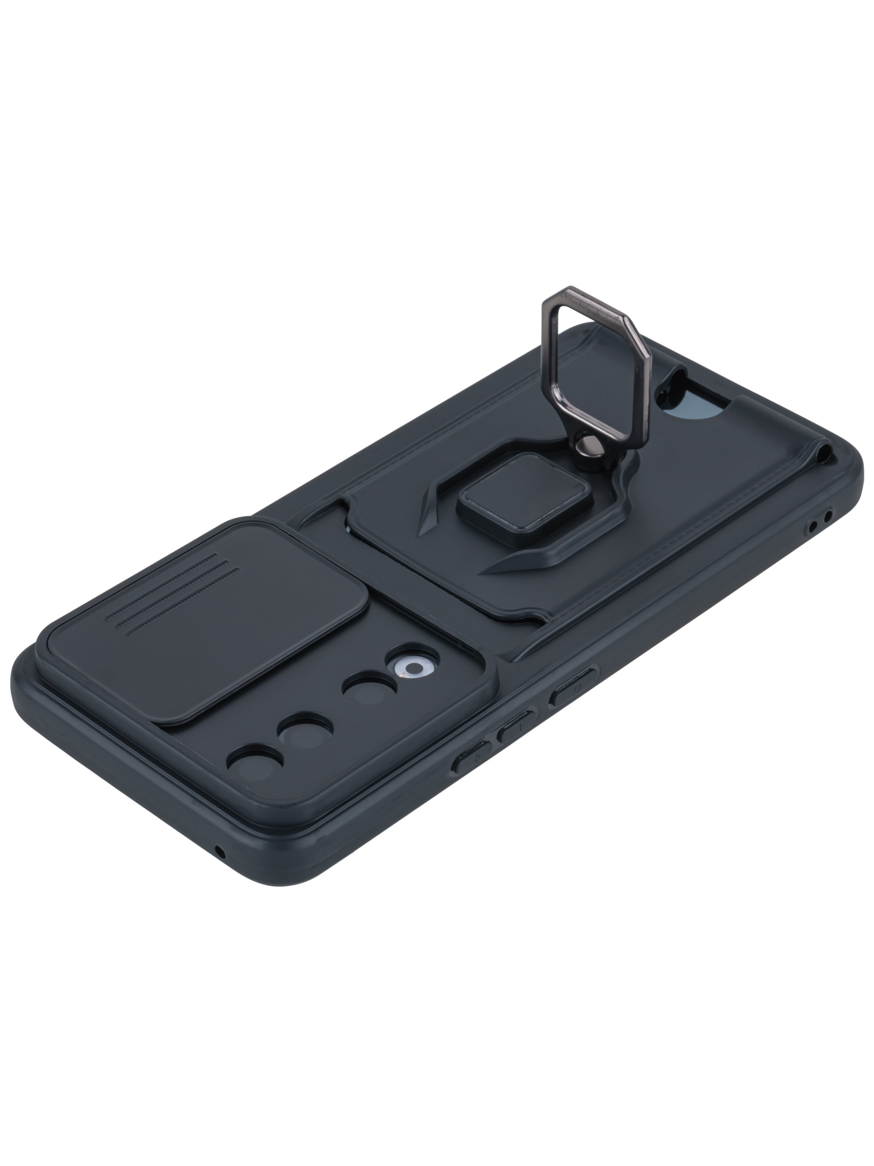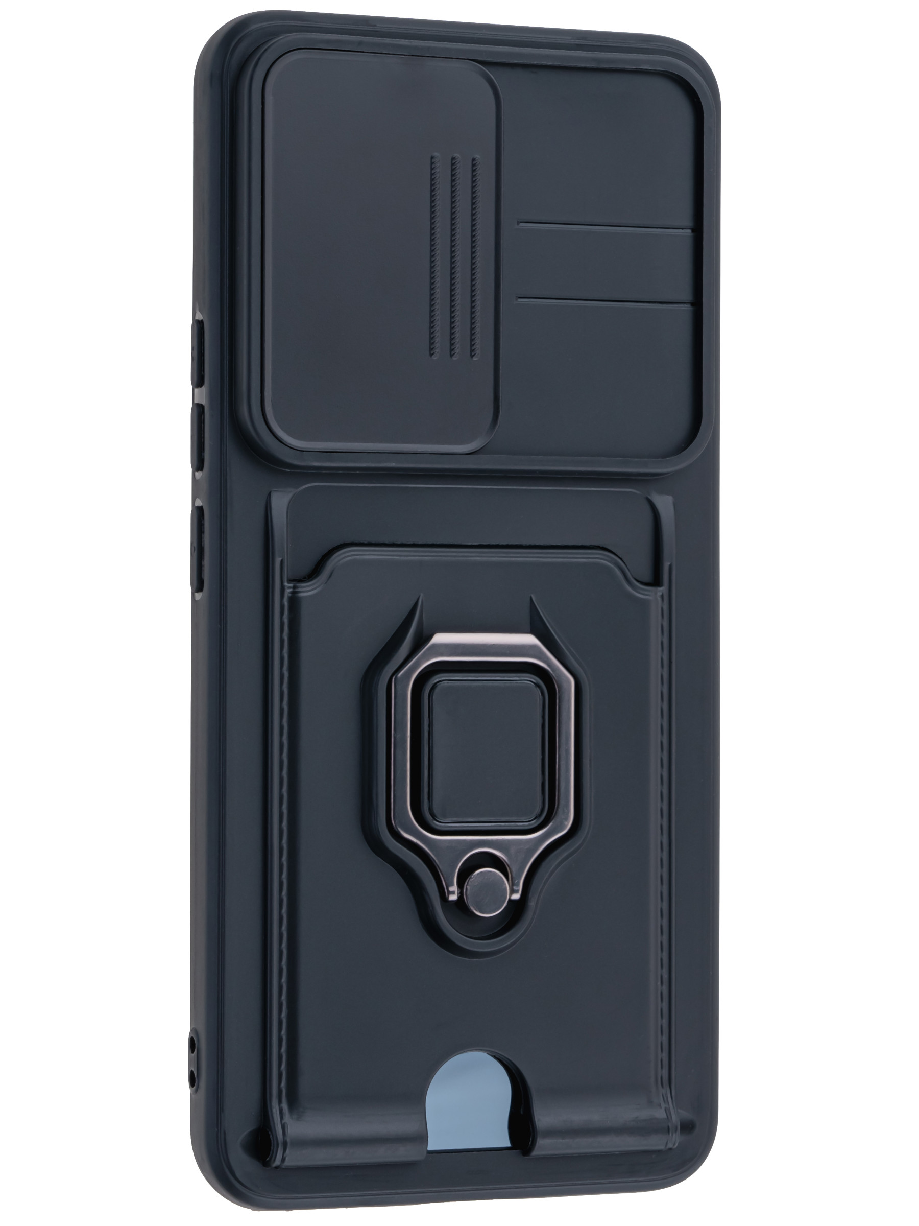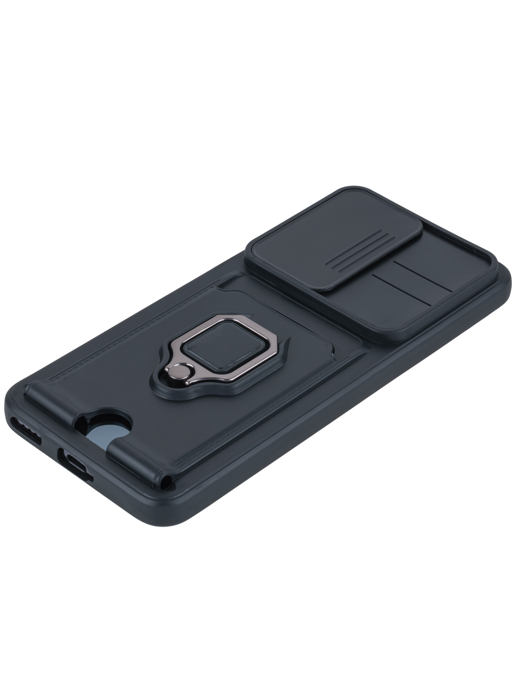 Силиконовый чехол с кольцом держателем из металла, который так же можно использовать к магнитному держателю. Такая конструкция не позволит выронить телефон из рук. Чехол с защитой камеры надежно закрывает её выдвижной шторкой, что защищает её от царапин и других повреждений. Защитный чехол с кармашком для карт - рассчитан исключительно для хранения карт и визиток. Не предусмотрен для бесконтактной оплаты. Чехол накладка идут с закрытым низом, с закрытой камерой и с защитой экрана, немного приподнятые рамки (бортики) над дисплеем телефона, позволят сохранить его без повреждений и царапин, если положить смартфон экраном вниз, а также смягчают удар при падении. Чехол с закрывающейся камерой и с картхолдером идеально подойдет мужчинам, благодаря своему массированному внешнему виду. Матовый чехол с подставкой, которой выступает кольцо держатель, позволяет использовать его в горизонтальном положении для удобного просмотра видеороликов. Встроенное в чехол отделение для карты позволяет поместить внутрь банковскую карту, проездной или пропуск, присутствует удобный вырез для установки и извлечения карты.