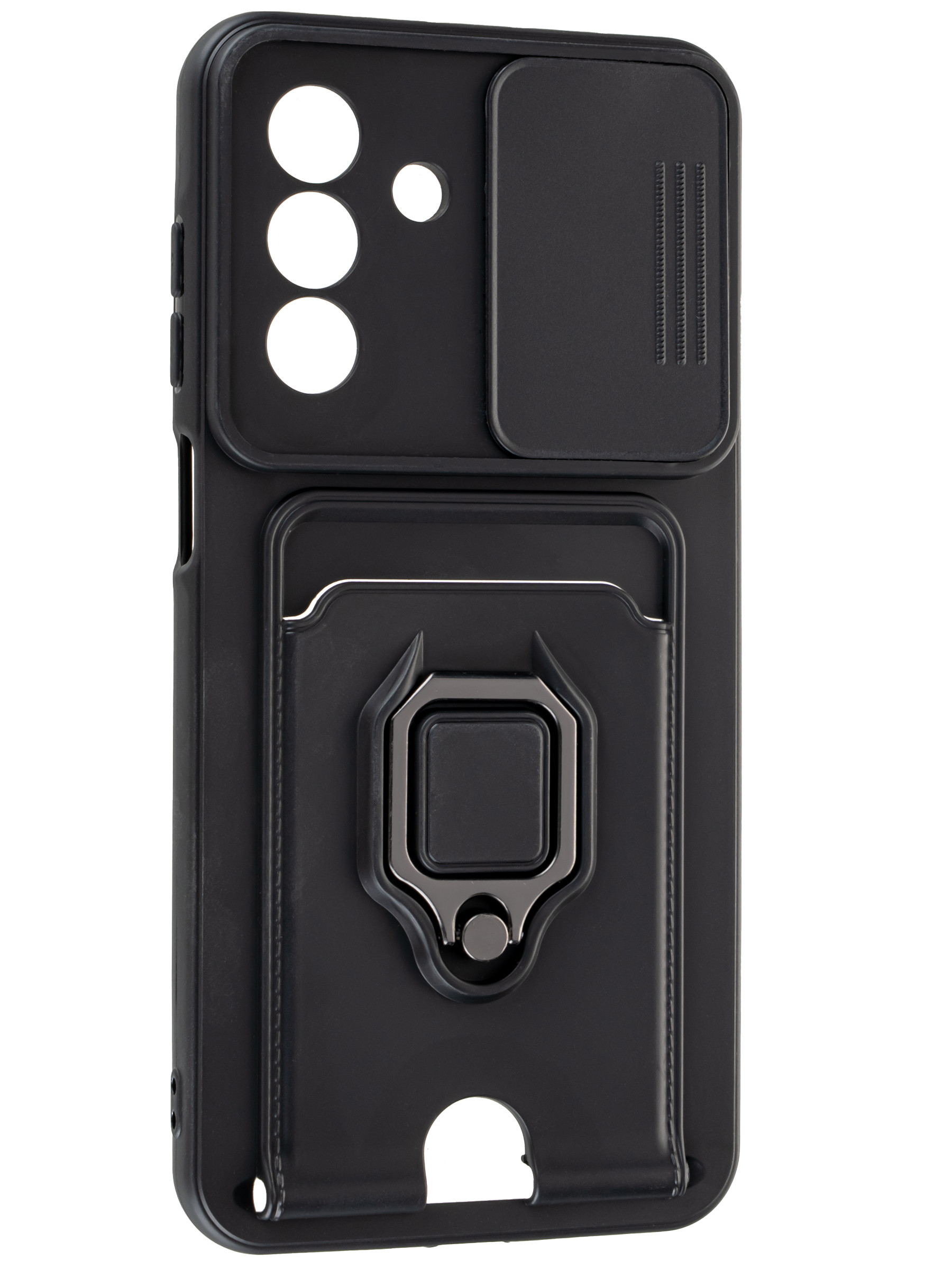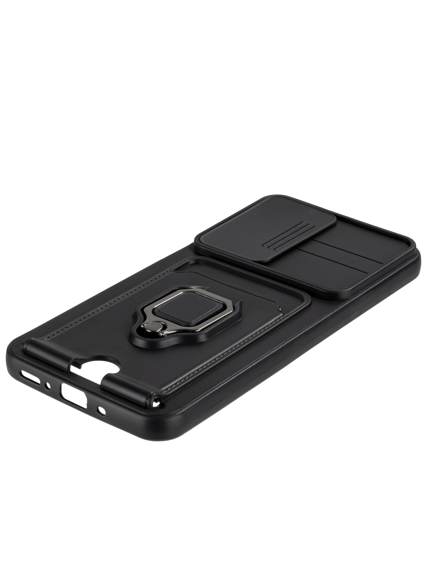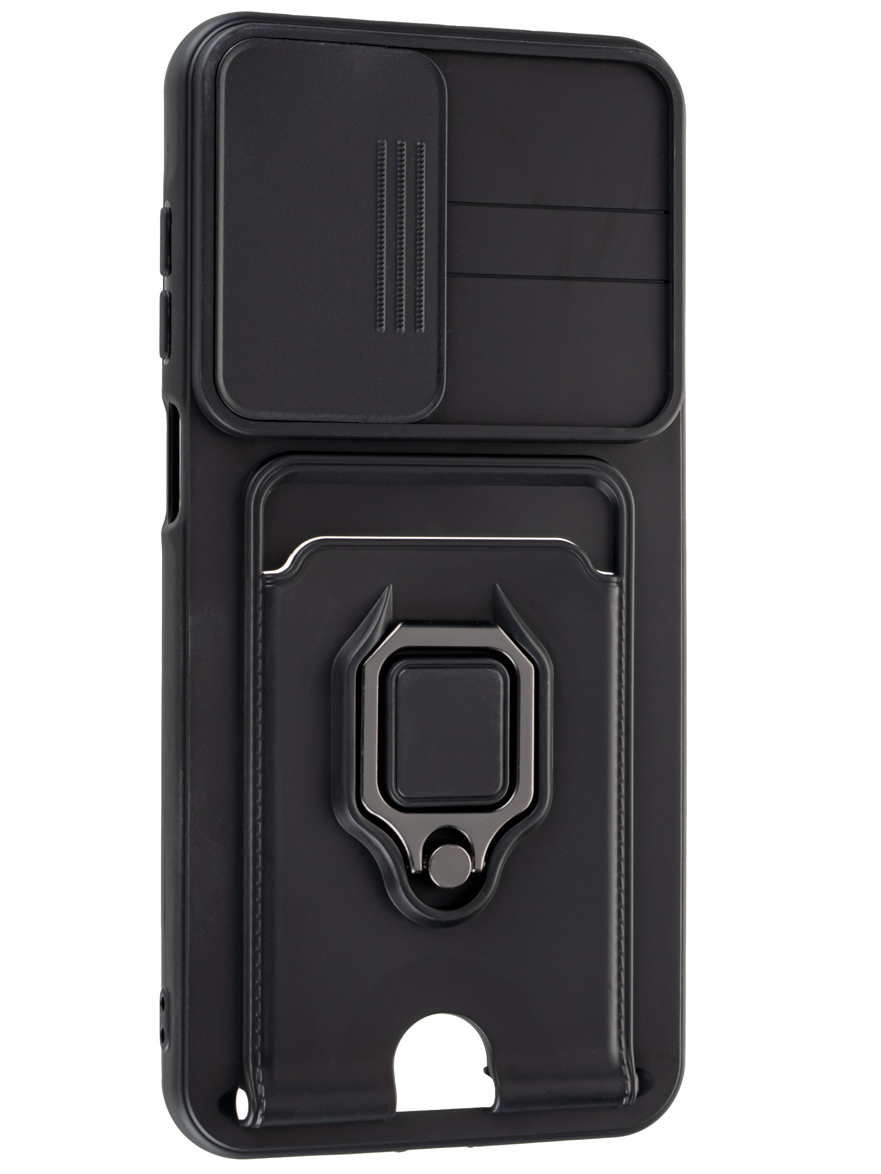 Силиконовый чехол с кольцом держателем из металла, который так же можно использовать к магнитному держателю. Такая конструкция не позволит выронить телефон из рук. Чехол с защитой камеры надежно закрывает её выдвижной шторкой, что защищает её от царапин и других повреждений. Защитный чехол с кармашком для карт - рассчитан исключительно для хранения карт и визиток. Не предусмотрен для бесконтактной оплаты. Чехол накладка идут с закрытым низом, с закрытой камерой и с защитой экрана, немного приподнятые рамки (бортики) над дисплеем телефона, позволят сохранить его без повреждений и царапин, если положить смартфон экраном вниз, а также смягчают удар при падении. Чехол с закрывающейся камерой и с картхолдером идеально подойдет мужчинам, благодаря своему массированному внешнему виду. Матовый чехол с подставкой, которой выступает кольцо держатель, позволяет использовать его в горизонтальном положении для удобного просмотра видеороликов. Встроенное в чехол отделение для карты позволяет поместить внутрь банковскую карту, проездной или пропуск, присутствует удобный вырез для установки и извлечения карты.