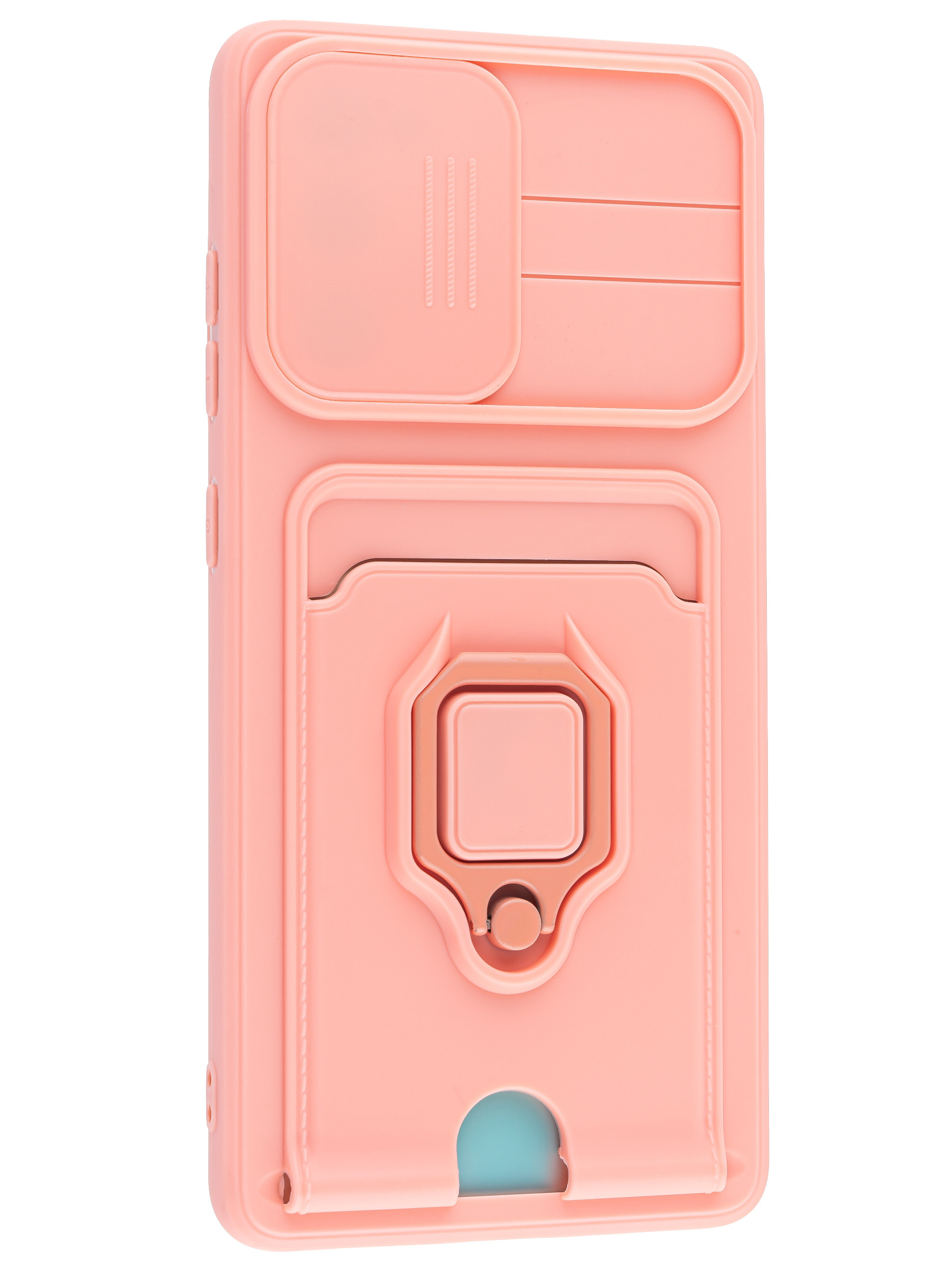 Силиконовый чехол с кольцом держателем из металла, который так же можно использовать к магнитному держателю. Такая конструкция не позволит выронить телефон из рук. Чехол с защитой камеры надежно закрывает её выдвижной шторкой, что защищает её от царапин и других повреждений. Защитный чехол с кармашком для карт - рассчитан исключительно для хранения карт и визиток. Не предусмотрен для бесконтактной оплаты. Чехол накладка идут с закрытым низом, с закрытой камерой и с защитой экрана, немного приподнятые рамки (бортики) над дисплеем телефона, позволят сохранить его без повреждений и царапин, если положить смартфон экраном вниз, а также смягчают удар при падении. Чехол с закрывающейся камерой и с картхолдером идеально подойдет мужчинам, благодаря своему массированному внешнему виду. Матовый чехол с подставкой, которой выступает кольцо держатель, позволяет использовать его в горизонтальном положении для удобного просмотра видеороликов. Встроенное в чехол отделение для карты позволяет поместить внутрь банковскую карту, проездной или пропуск, присутствует удобный вырез для установки и извлечения карты.