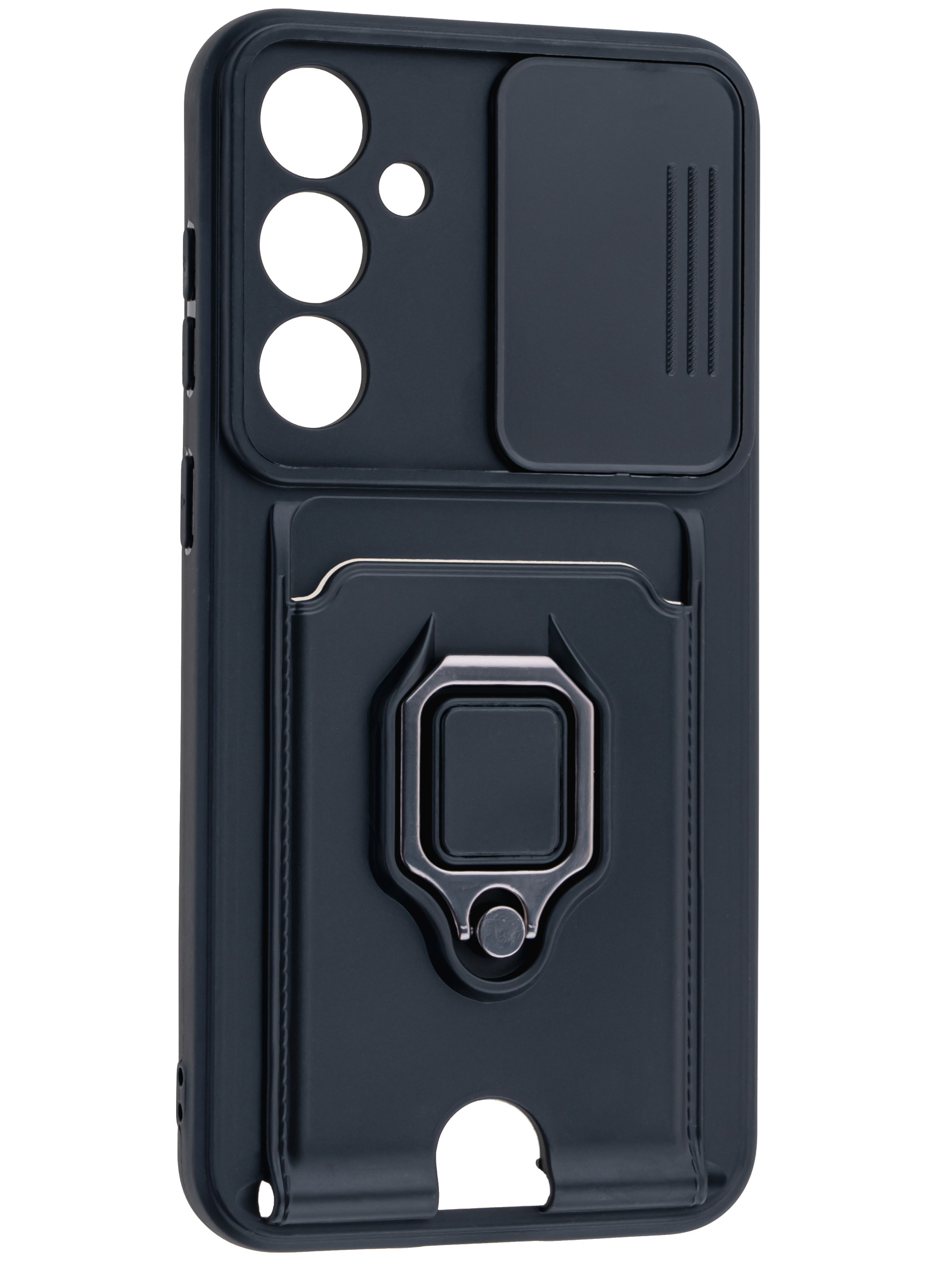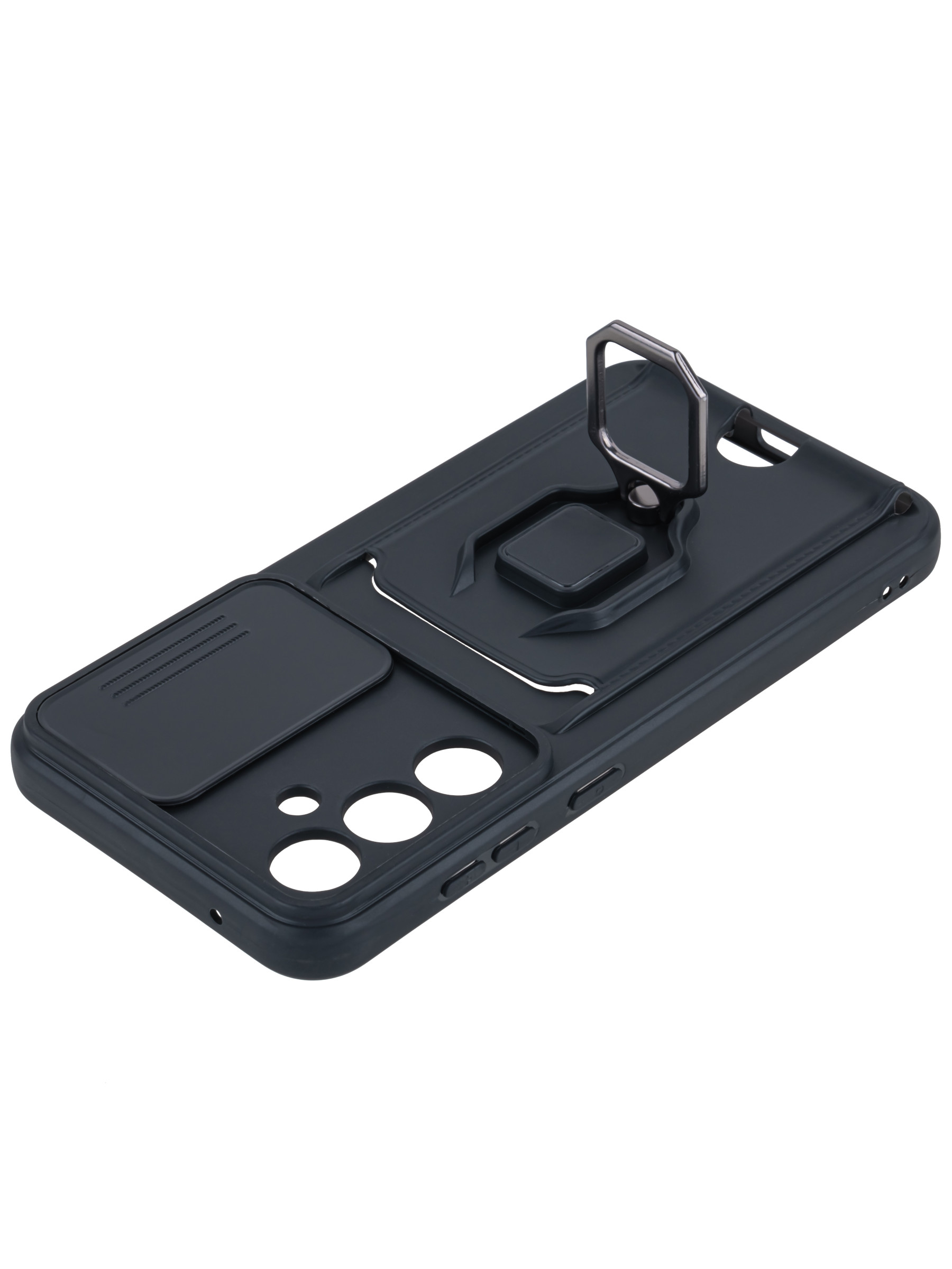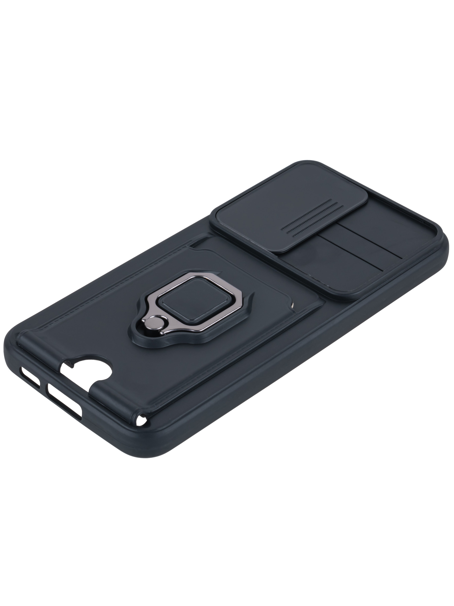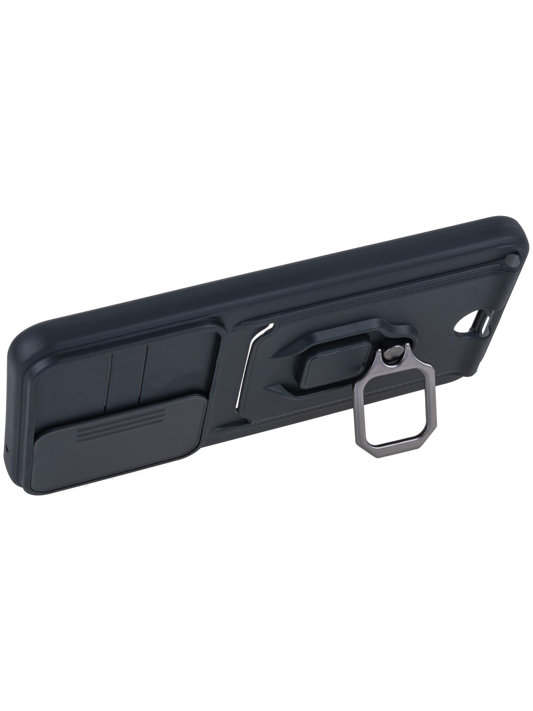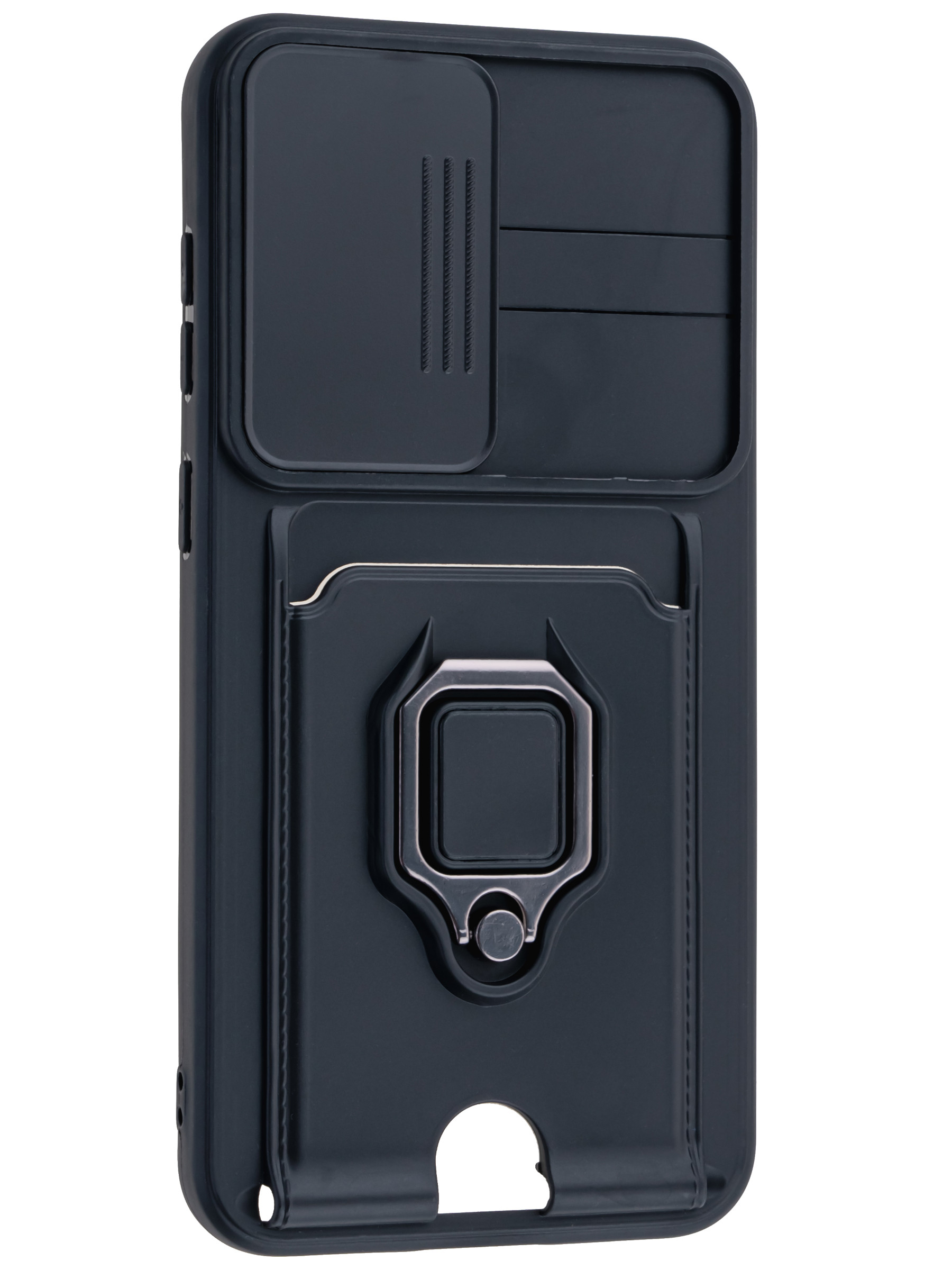 Силиконовый чехол с кольцом держателем из металла, который так же можно использовать к магнитному держателю. Такая конструкция не позволит выронить телефон из рук. Чехол с защитой камеры надежно закрывает её выдвижной шторкой, что защищает её от царапин и других повреждений. Защитный чехол с кармашком для карт - рассчитан исключительно для хранения карт и визиток. Не предусмотрен для бесконтактной оплаты. Чехол накладка идут с закрытым низом, с закрытой камерой и с защитой экрана, немного приподнятые рамки (бортики) над дисплеем телефона, позволят сохранить его без повреждений и царапин, если положить смартфон экраном вниз, а также смягчают удар при падении. Чехол с закрывающейся камерой и с картхолдером идеально подойдет мужчинам, благодаря своему массированному внешнему виду. Матовый чехол с подставкой, которой выступает кольцо держатель, позволяет использовать его в горизонтальном положении для удобного просмотра видеороликов. Встроенное в чехол отделение для карты позволяет поместить внутрь банковскую карту, проездной или пропуск, присутствует удобный вырез для установки и извлечения карты.