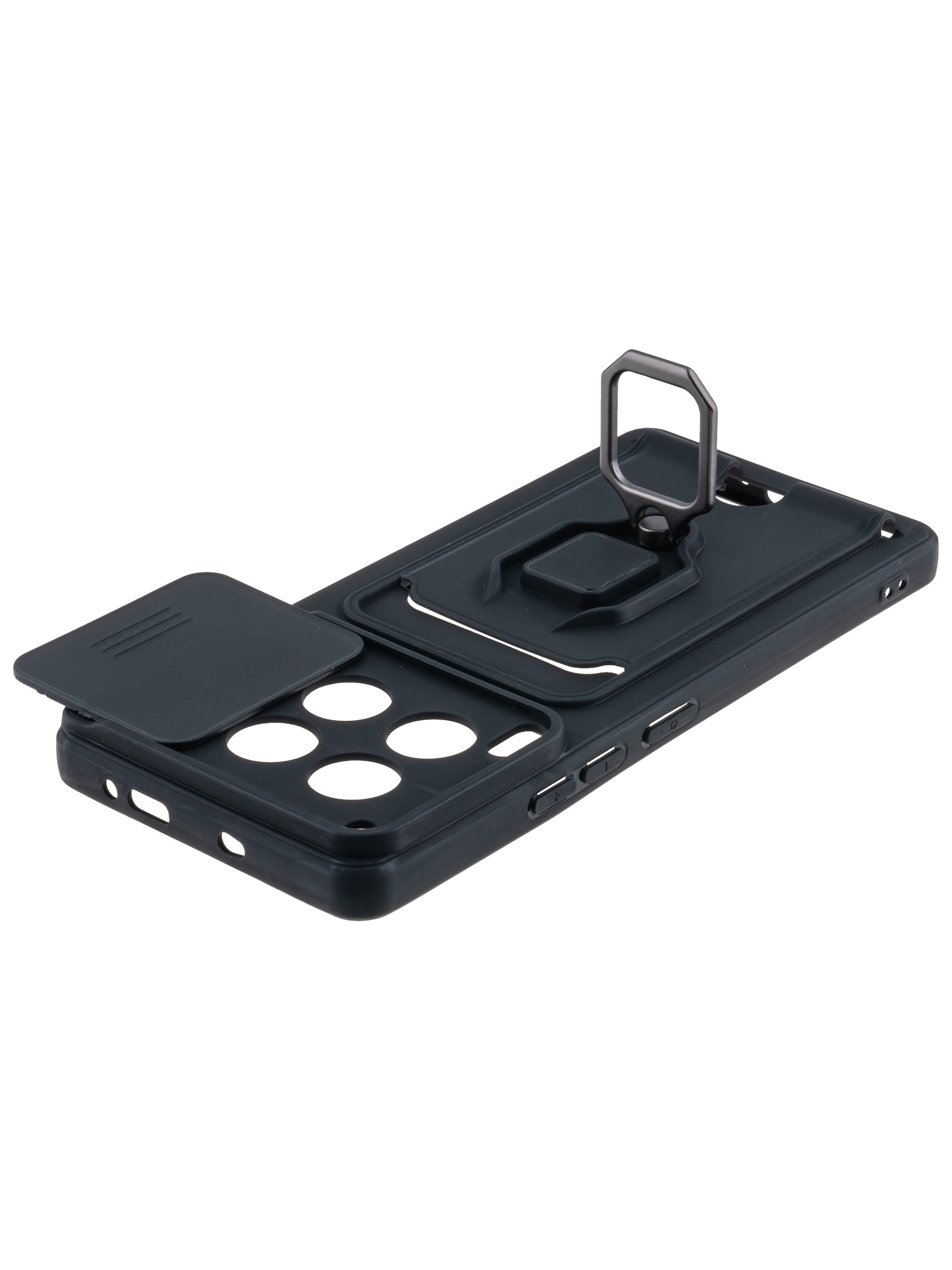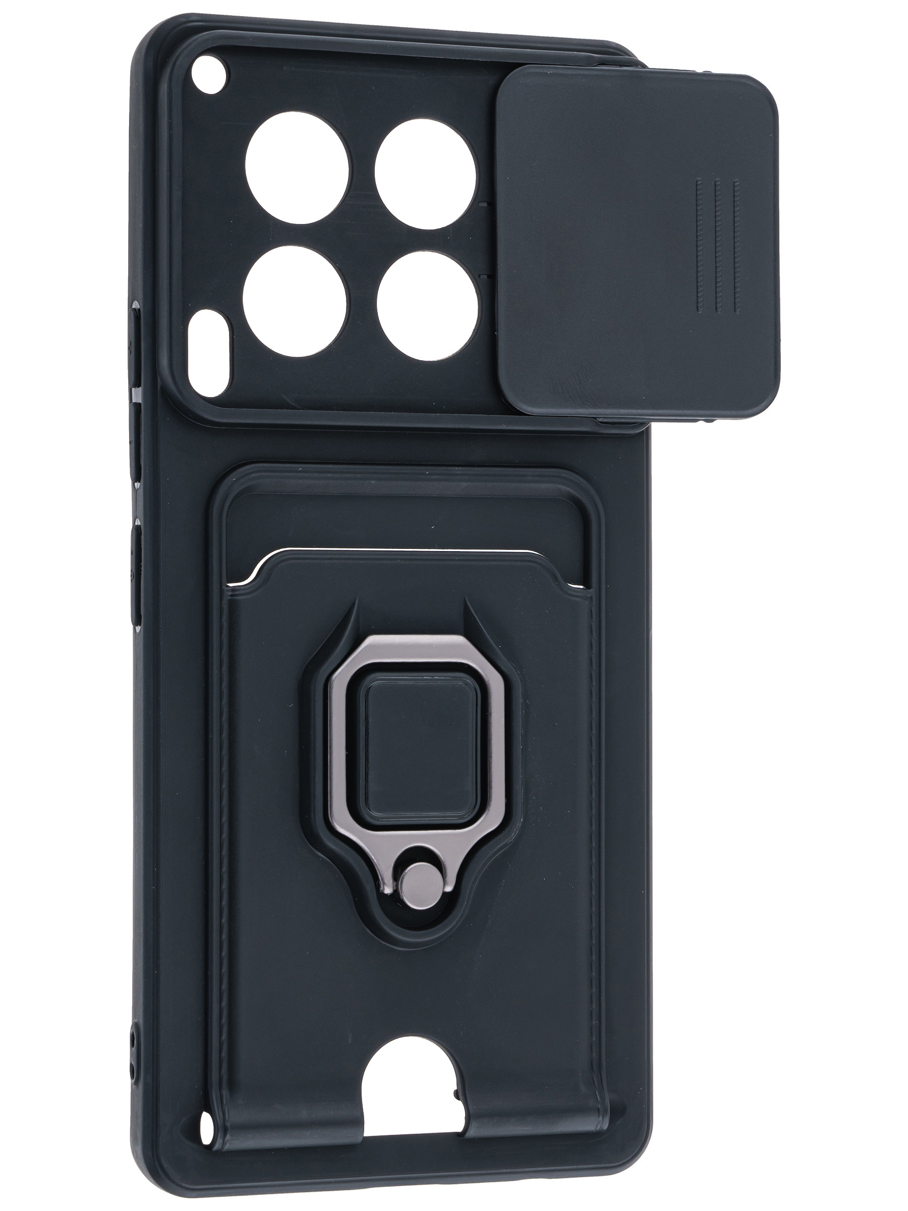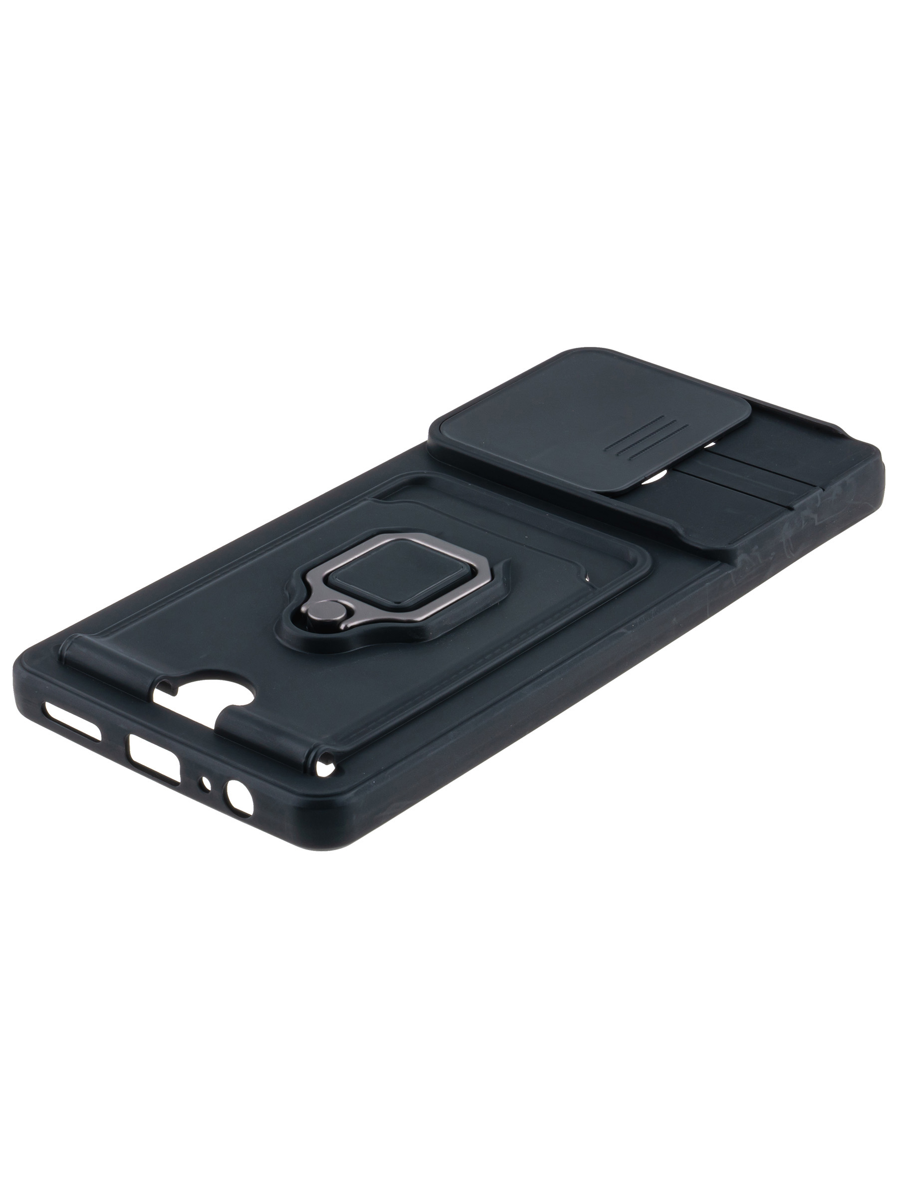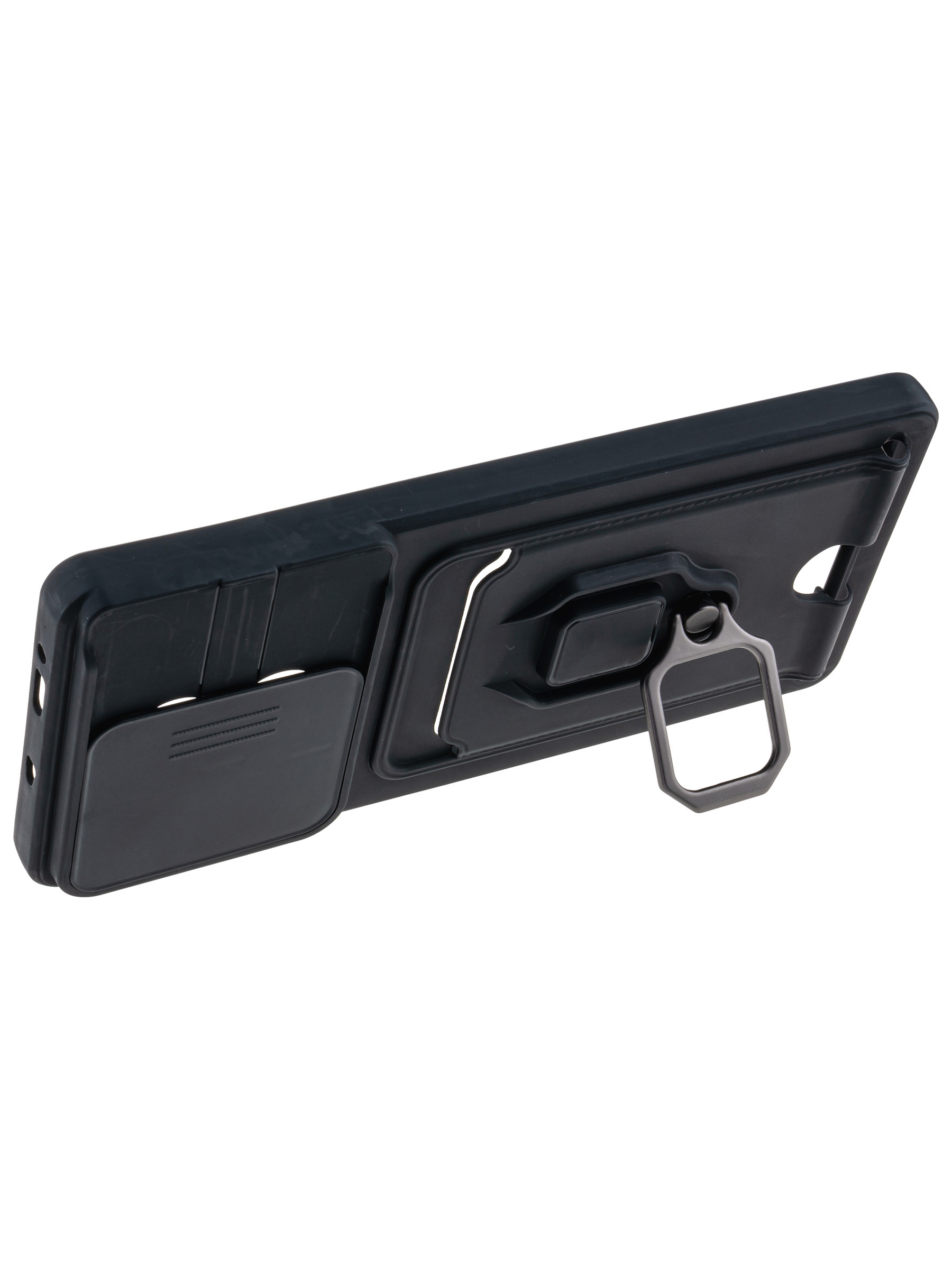 Силиконовый чехол с кольцом держателем из металла, который так же можно использовать к магнитному держателю. Такая конструкция не позволит выронить телефон из рук. Чехол с защитой камеры надежно закрывает её выдвижной шторкой, что защищает её от царапин и других повреждений. Защитный чехол с кармашком для карт - рассчитан исключительно для хранения карт и визиток. Не предусмотрен для бесконтактной оплаты. Чехол накладка идут с закрытым низом, с закрытой камерой и с защитой экрана, немного приподнятые рамки (бортики) над дисплеем телефона, позволят сохранить его без повреждений и царапин, если положить смартфон экраном вниз, а также смягчают удар при падении. Чехол с закрывающейся камерой и с картхолдером идеально подойдет мужчинам, благодаря своему массированному внешнему виду. Матовый чехол с подставкой, которой выступает кольцо держатель, позволяет использовать его в горизонтальном положении для удобного просмотра видеороликов. Встроенное в чехол отделение для карты позволяет поместить внутрь банковскую карту, проездной или пропуск, присутствует удобный вырез для установки и извлечения карты.