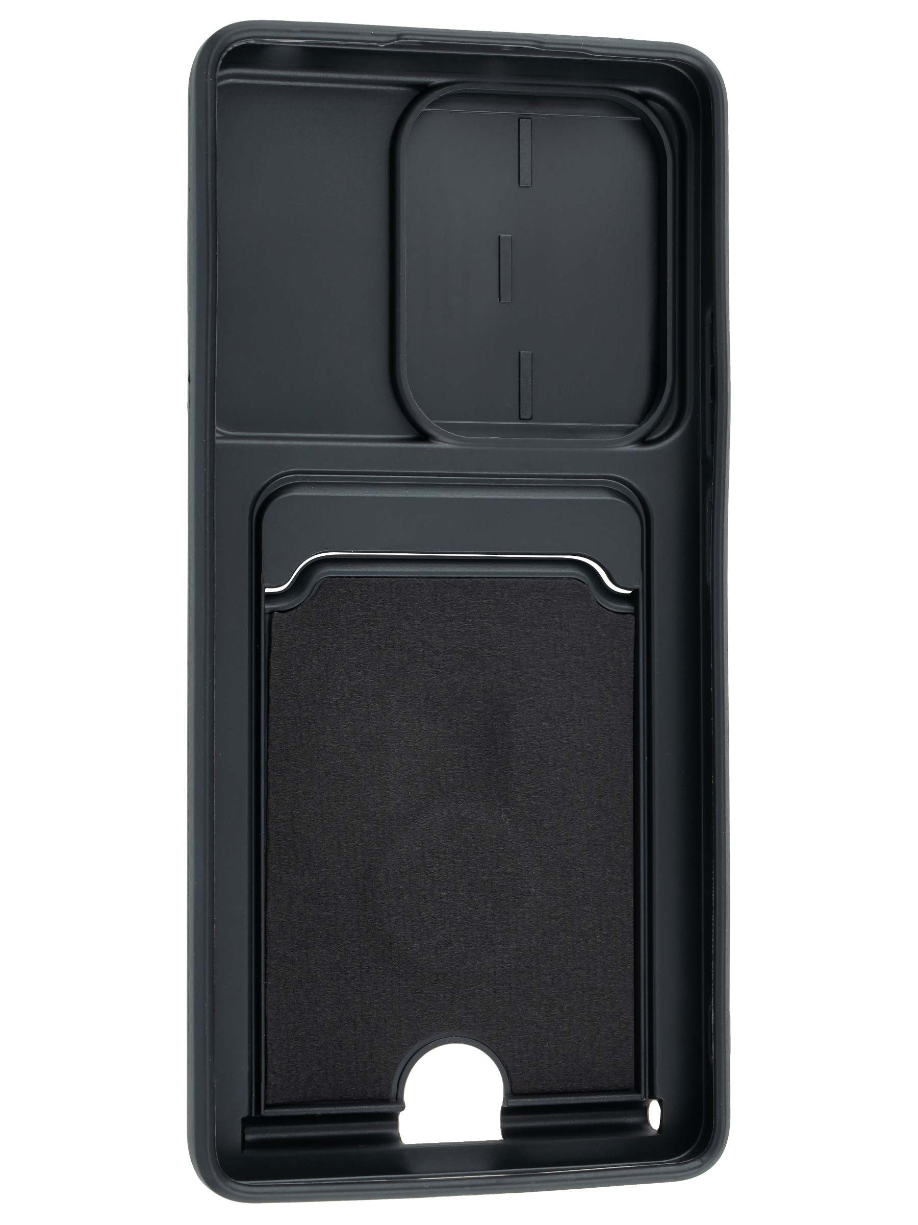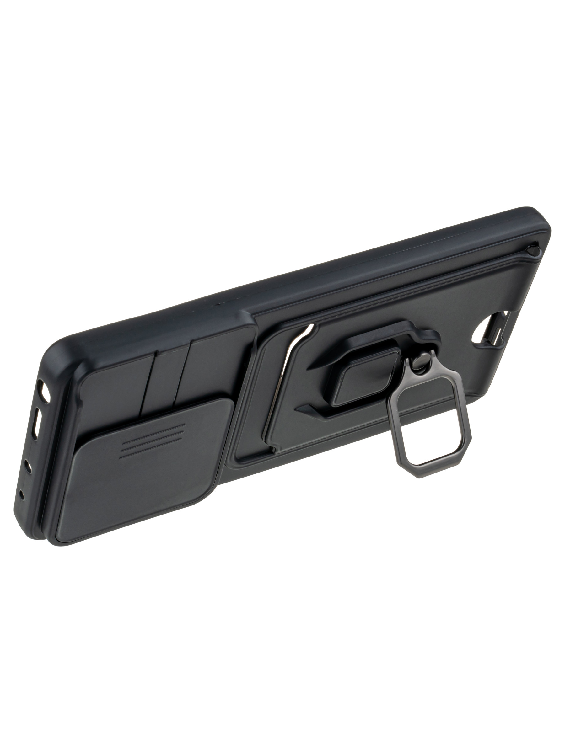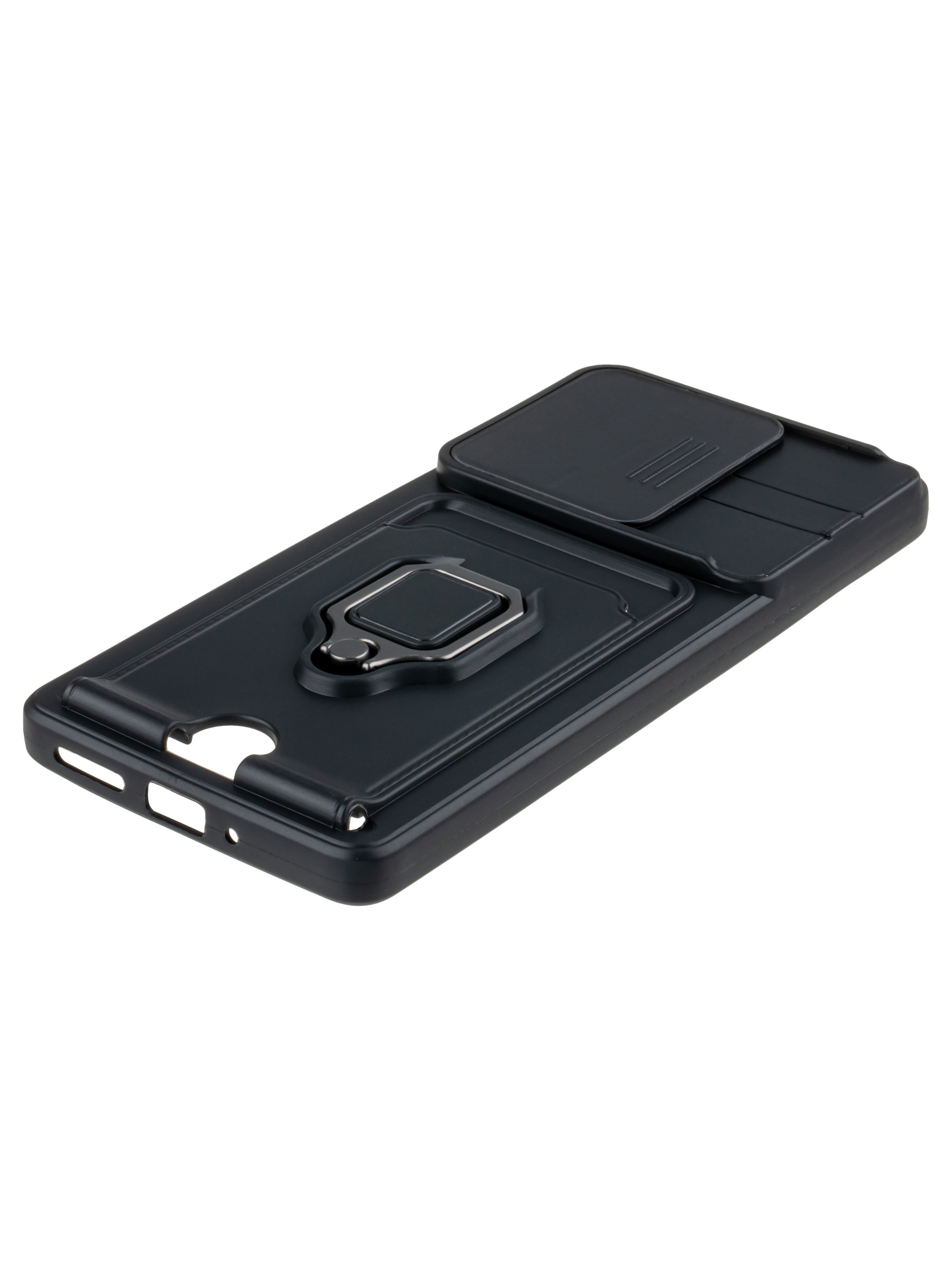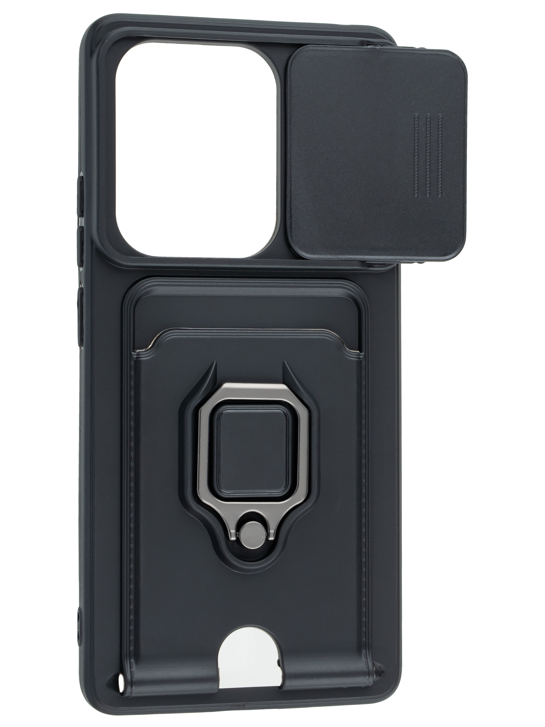 Силиконовый чехол с кольцом держателем из металла, который так же можно использовать к магнитному держателю. Такая конструкция не позволит выронить телефон из рук. Чехол с защитой камеры надежно закрывает её выдвижной шторкой, что защищает её от царапин и других повреждений. Защитный чехол с кармашком для карт - рассчитан исключительно для хранения карт и визиток. Не предусмотрен для бесконтактной оплаты. Чехол накладка идут с закрытым низом, с закрытой камерой и с защитой экрана, немного приподнятые рамки (бортики) над дисплеем телефона, позволят сохранить его без повреждений и царапин, если положить смартфон экраном вниз, а также смягчают удар при падении. Чехол с закрывающейся камерой и с картхолдером идеально подойдет мужчинам, благодаря своему массированному внешнему виду. Матовый чехол с подставкой, которой выступает кольцо держатель, позволяет использовать его в горизонтальном положении для удобного просмотра видеороликов. Встроенное в чехол отделение для карты позволяет поместить внутрь банковскую карту, проездной или пропуск, присутствует удобный вырез для установки и извлечения карты.