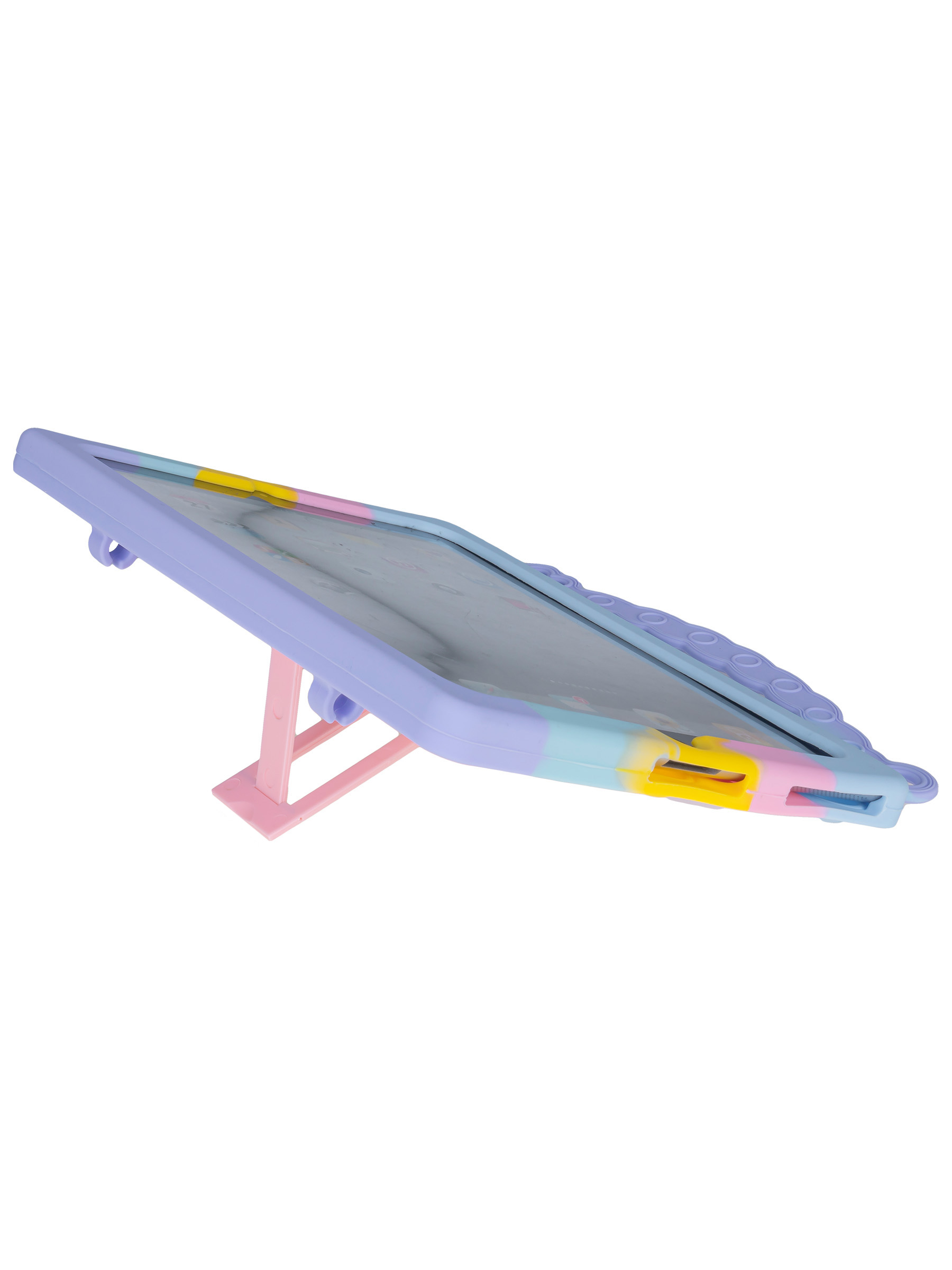 Детский силиконовый чехол для планшета, который легко преобразуется в удобную подставку и позволяет использовать планшет в любом положении. Бортик чехла выступает над дисплеем, что позволяет спокойно класть планшет экраном вниз, защищая его от царапин.