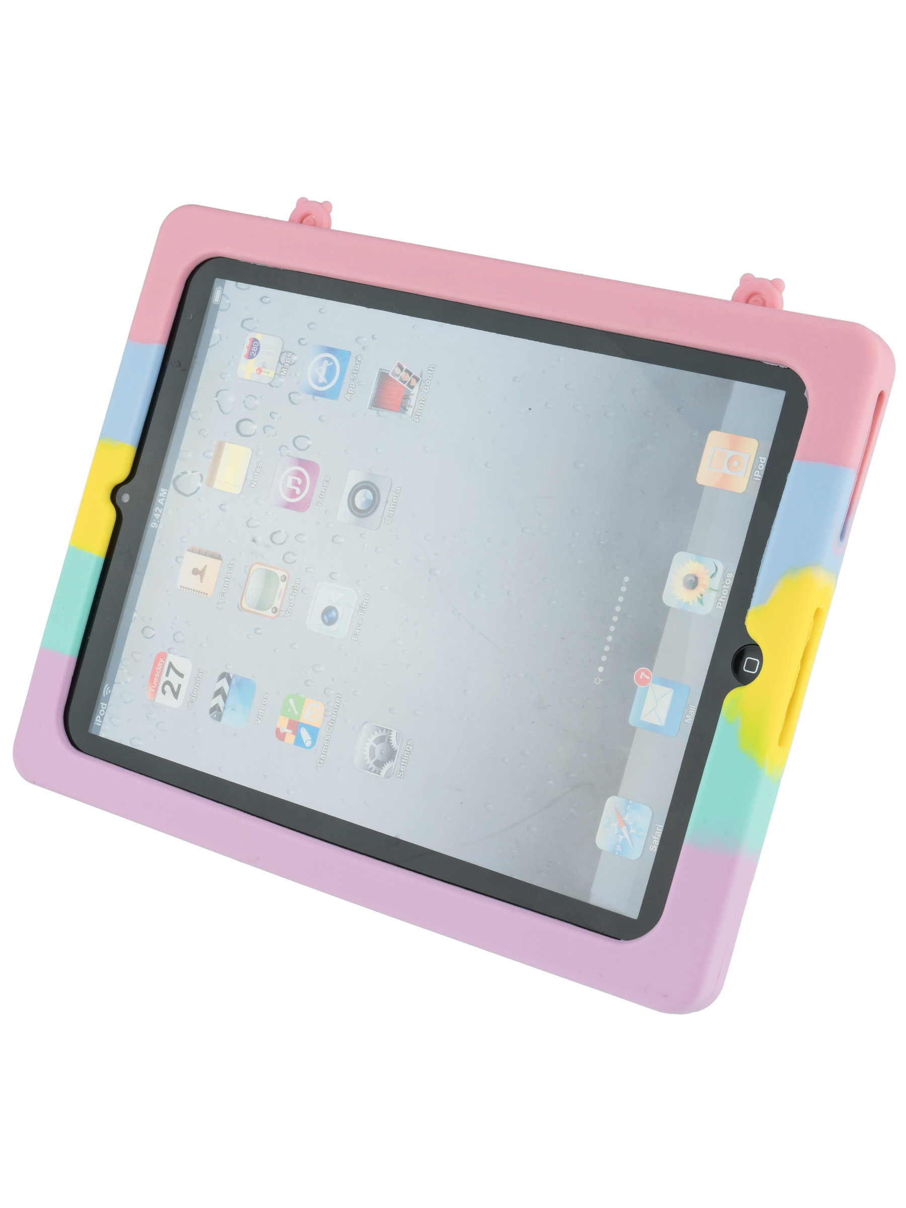 Детский силиконовый чехол для планшета, который легко преобразуется в удобную подставку и позволяет использовать планшет в любом положении. Бортик чехла выступает над дисплеем, что позволяет спокойно класть планшет экраном вниз, защищая его от царапин.