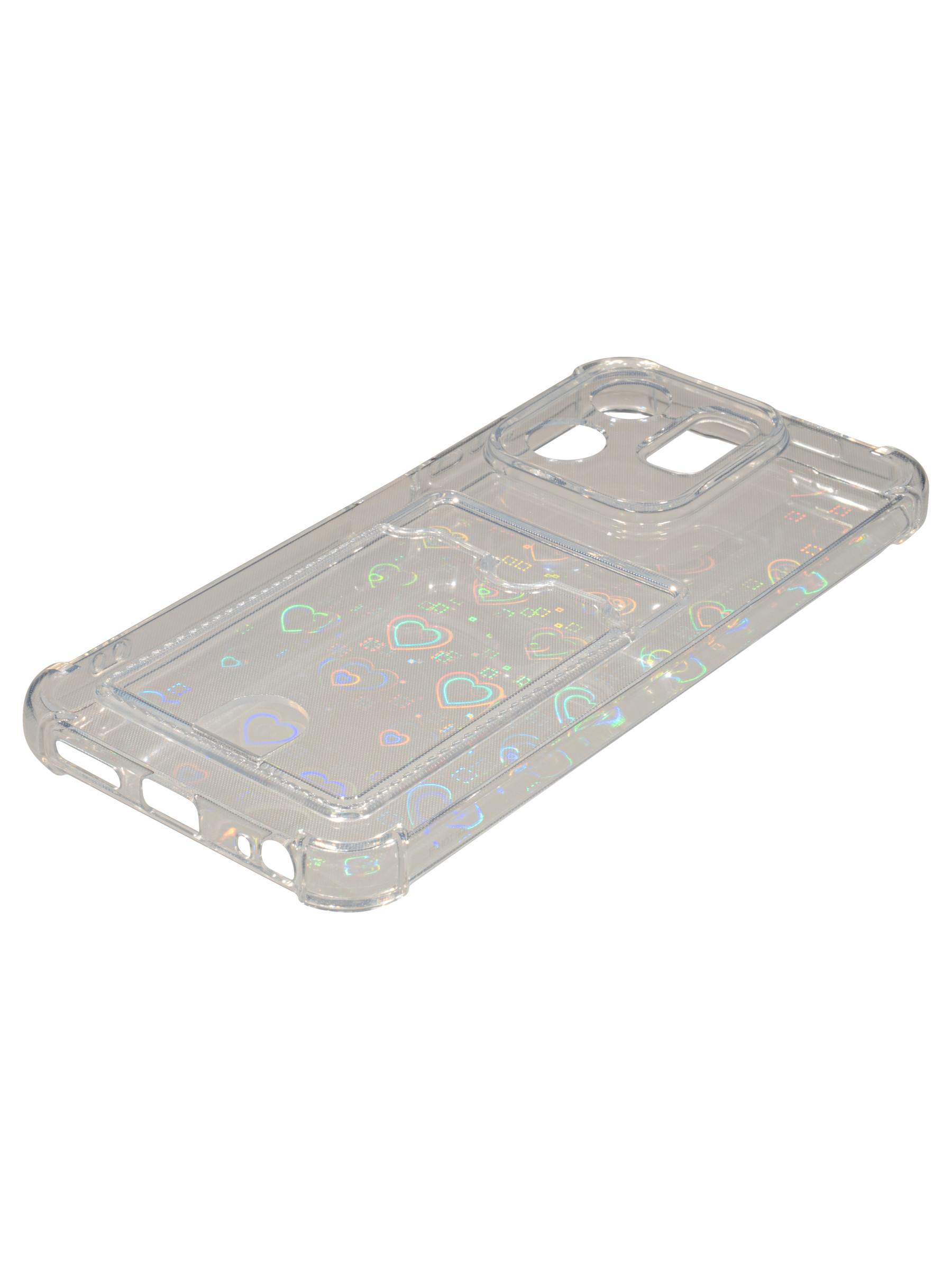 Противоударный силиконовый чехол со съемной мерцающей подложкой и кармашком. Рассчитан исключительно для хранения карт и визиток. Не предусмотрен для бесконтактной оплаты. Все вырезы идеально подогнаны.Серия White heart.