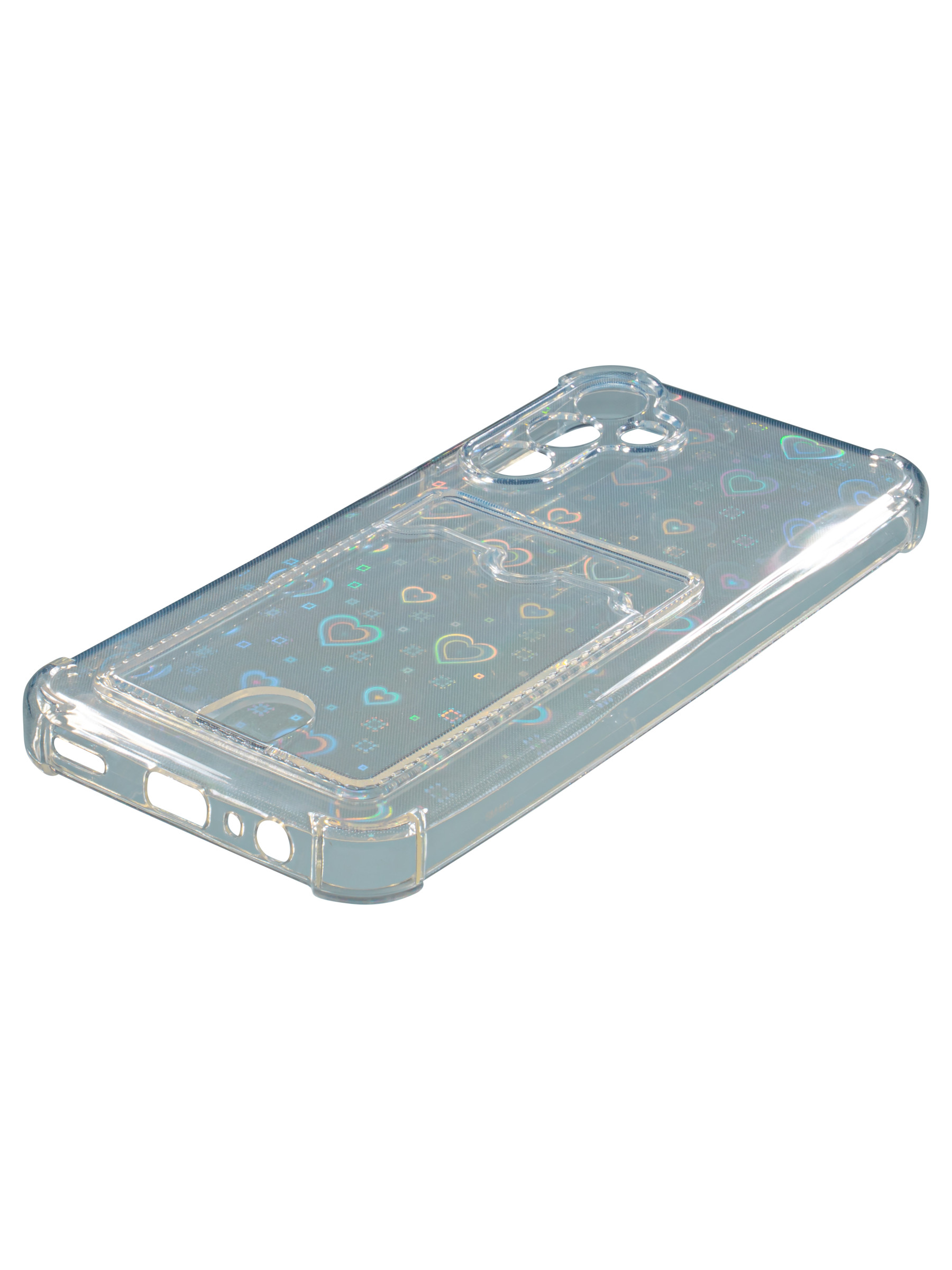 Противоударный силиконовый чехол со съемной мерцающей подложкой и кармашком. Рассчитан исключительно для хранения карт и визиток. Не предусмотрен для бесконтактной оплаты. Все вырезы идеально подогнаны.Серия White heart.
