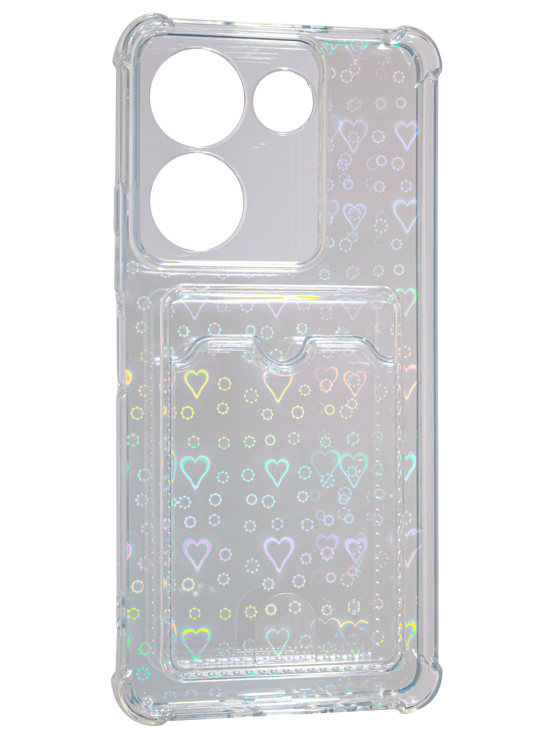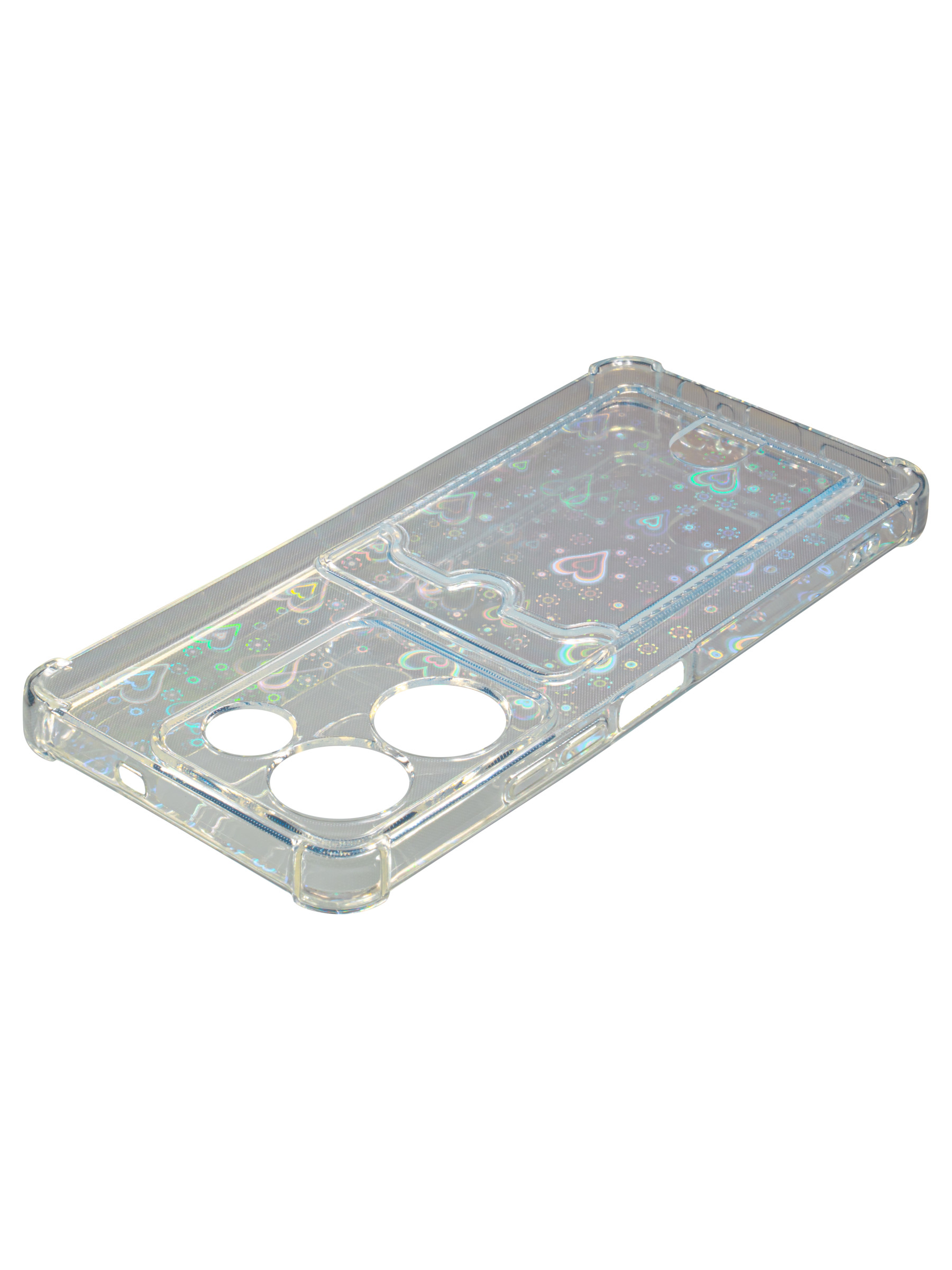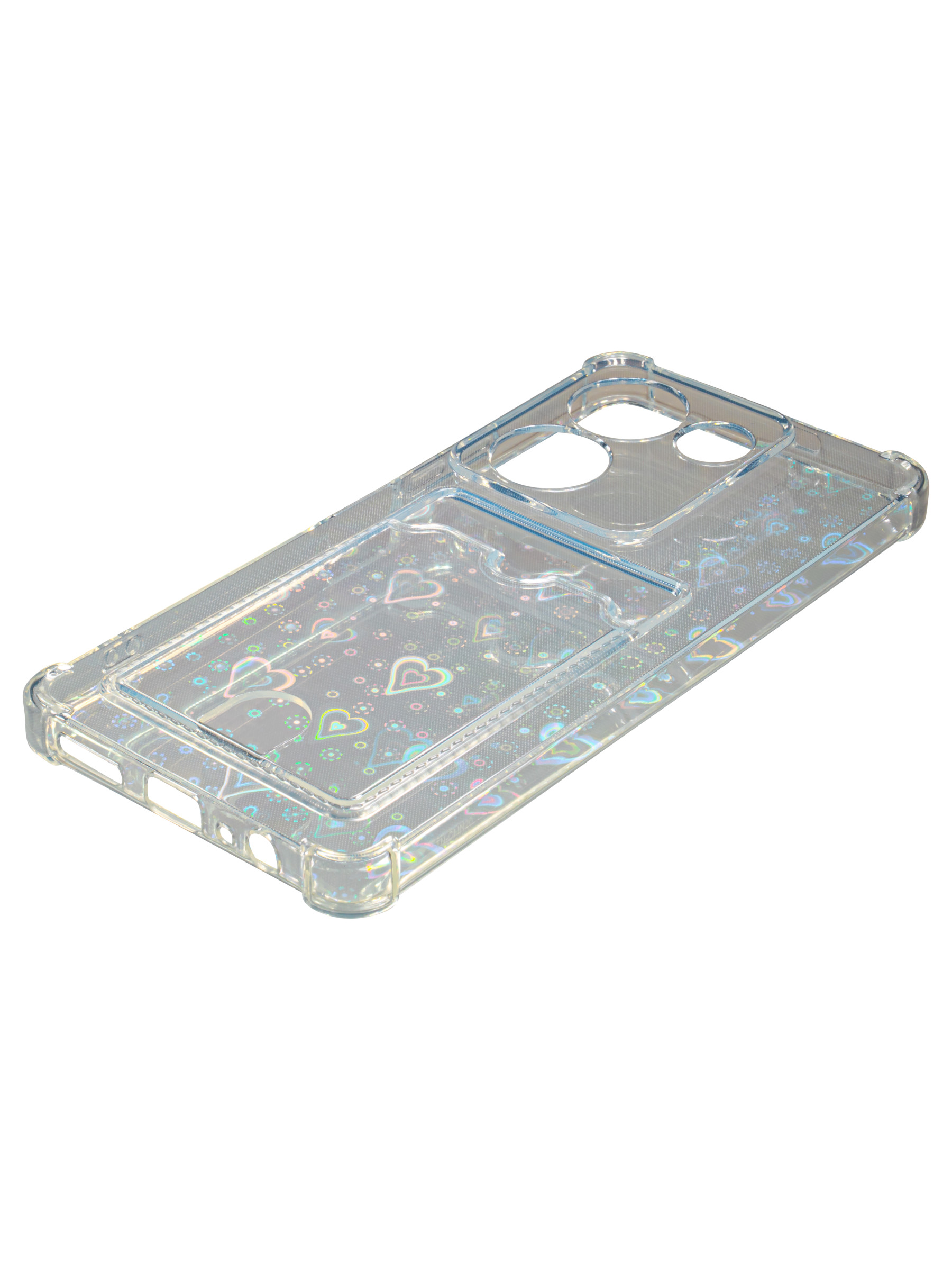 Противоударный силиконовый чехол со съемной мерцающей подложкой и кармашком. Рассчитан исключительно для хранения карт и визиток. Не предусмотрен для бесконтактной оплаты. Все вырезы идеально подогнаны.Серия White heart.