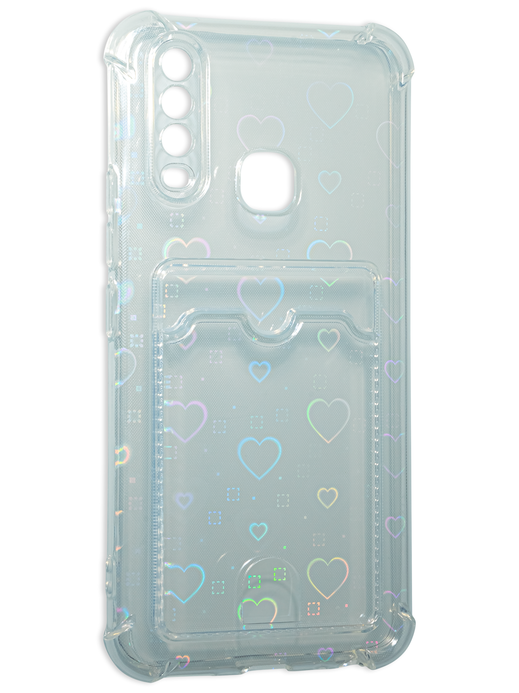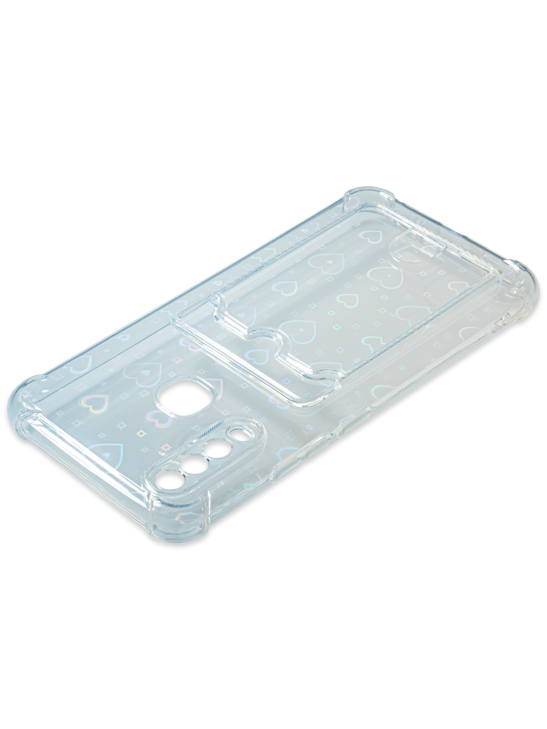 Противоударный силиконовый чехол со съемной мерцающей подложкой и кармашком. Рассчитан исключительно для хранения карт и визиток. Не предусмотрен для бесконтактной оплаты. Все вырезы идеально подогнаны.Серия White heart.