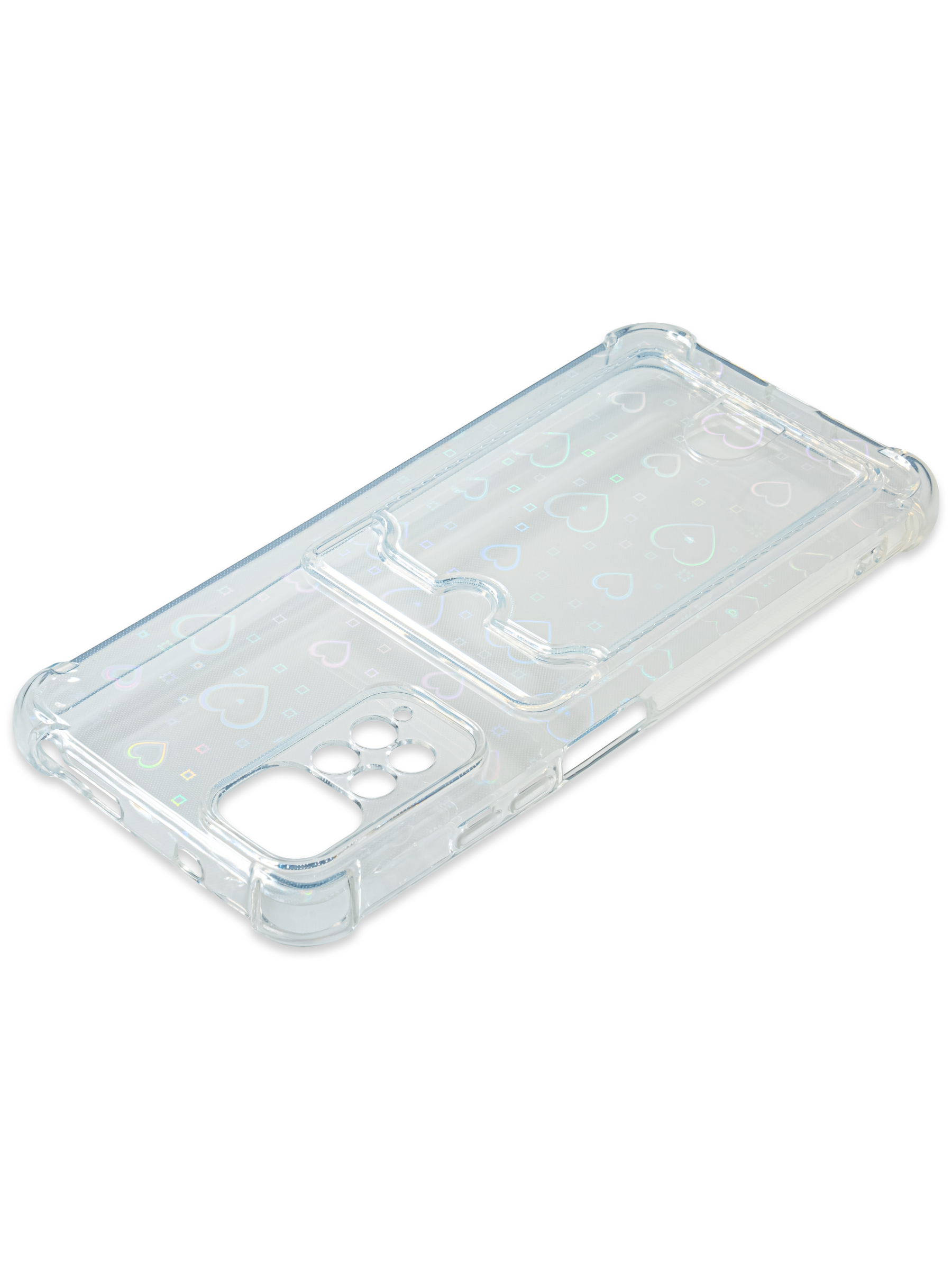 Противоударный силиконовый чехол со съемной мерцающей подложкой и кармашком. Рассчитан исключительно для хранения карт и визиток. Не предусмотрен для бесконтактной оплаты. Все вырезы идеально подогнаны.Серия White heart.