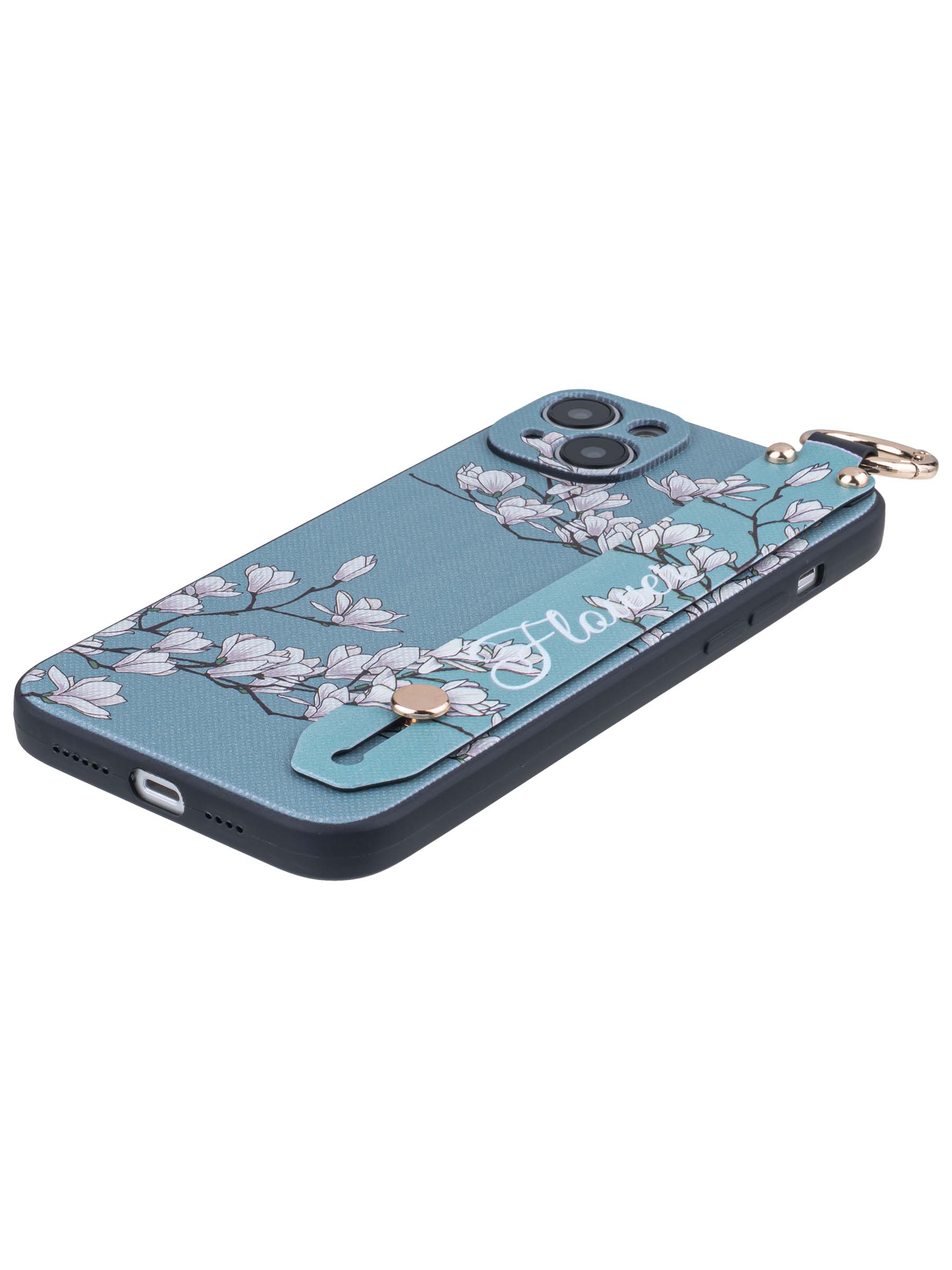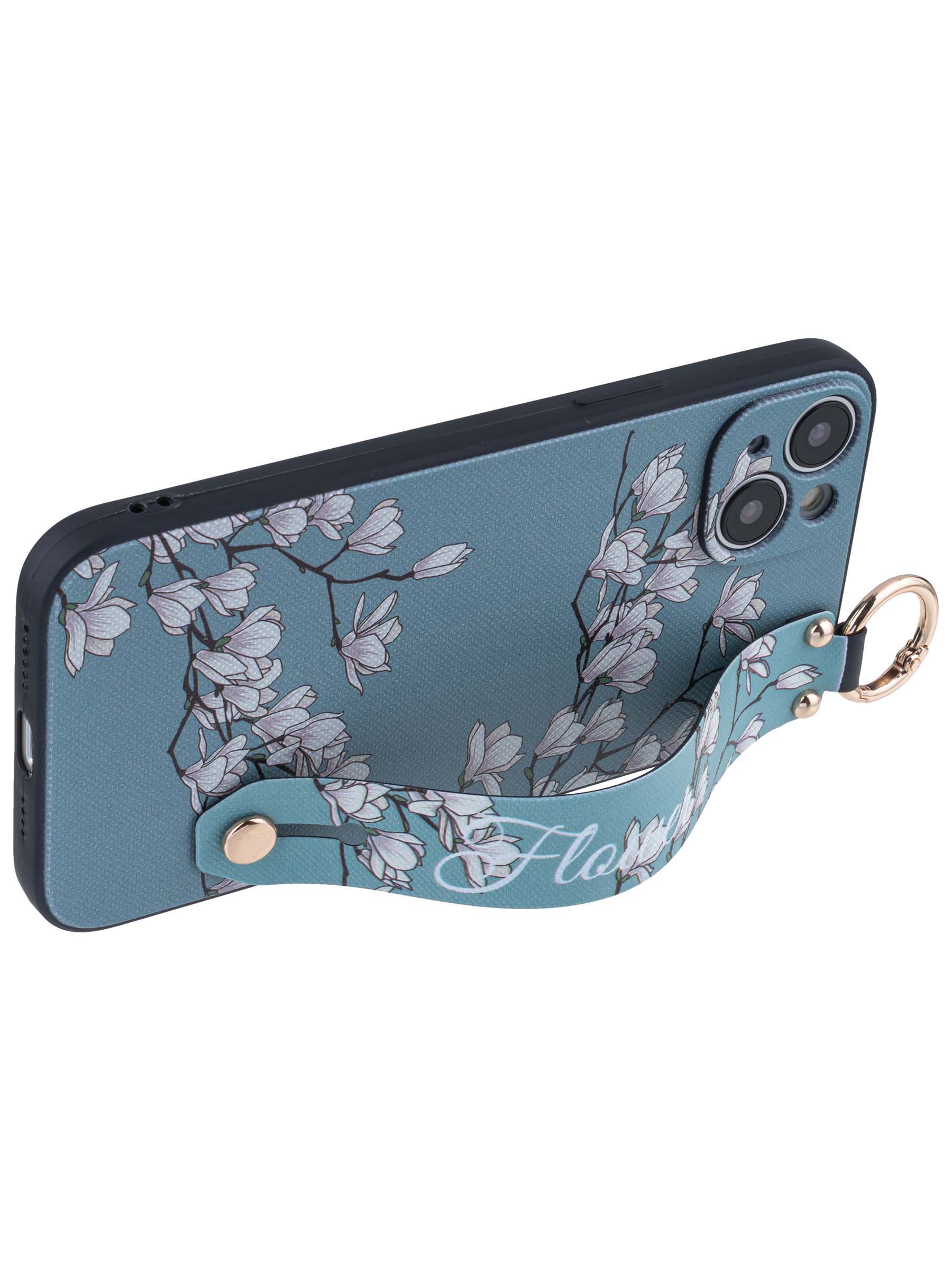 Силиконовый чехол Flower для iPhone 14 Plus / 15 Plus Цветение магнолии (с ручкой) голубой
