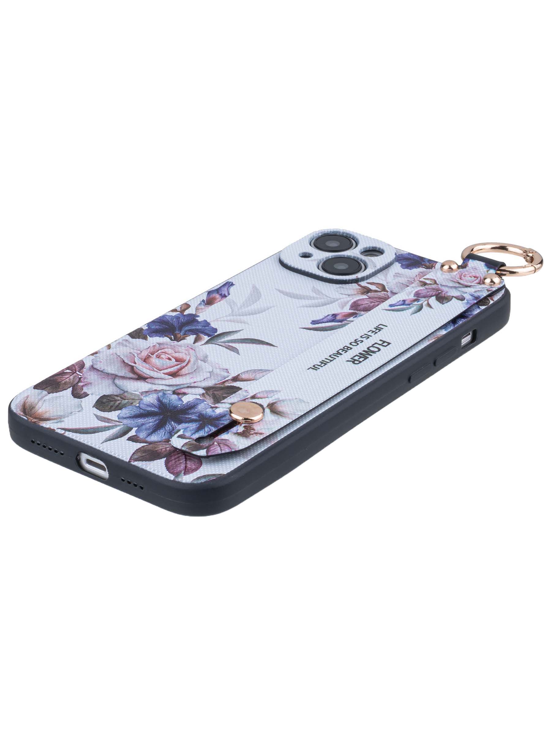 Силиконовый чехол Flower для iPhone 14 Plus / 15 Plus Цветущая роза (с ручкой) белый