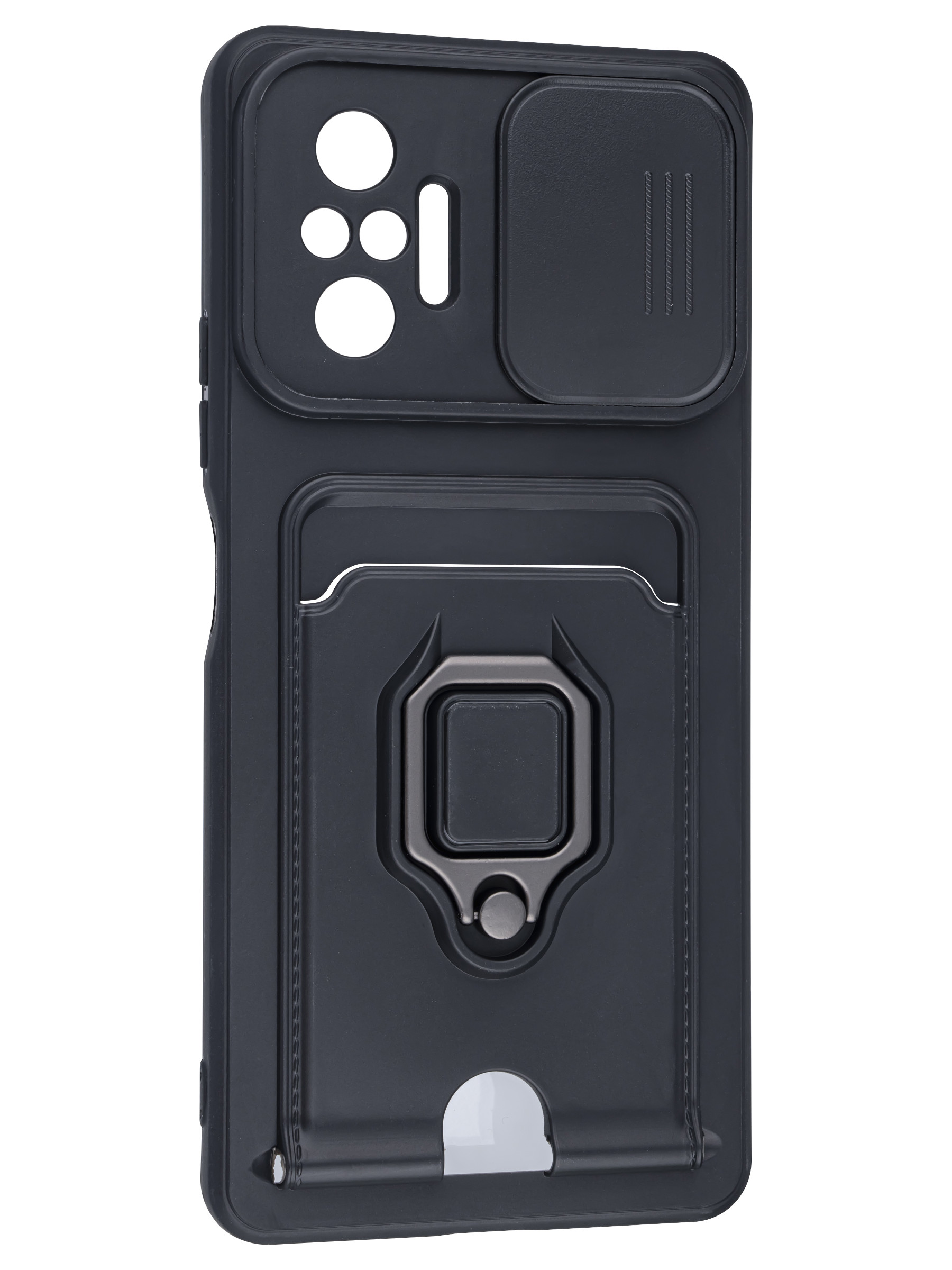 Силиконовый чехол с кольцом держателем из металла, который так же можно использовать к магнитному держателю. Такая конструкция не позволит выронить телефон из рук. Чехол с защитой камеры надежно закрывает её выдвижной шторкой, что защищает её от царапин и других повреждений. Защитный чехол с кармашком для карт - рассчитан исключительно для хранения карт и визиток. Не предусмотрен для бесконтактной оплаты. Чехол накладка идут с закрытым низом, с закрытой камерой и с защитой экрана, немного приподнятые рамки (бортики) над дисплеем телефона, позволят сохранить его без повреждений и царапин, если положить смартфон экраном вниз, а также смягчают удар при падении. Чехол с закрывающейся камерой и с картхолдером идеально подойдет мужчинам, благодаря своему массированному внешнему виду. Матовый чехол с подставкой, которой выступает кольцо держатель, позволяет использовать его в горизонтальном положении для удобного просмотра видеороликов. Встроенное в чехол отделение для карты позволяет поместить внутрь банковскую карту, проездной или пропуск, присутствует удобный вырез для установки и извлечения карты.