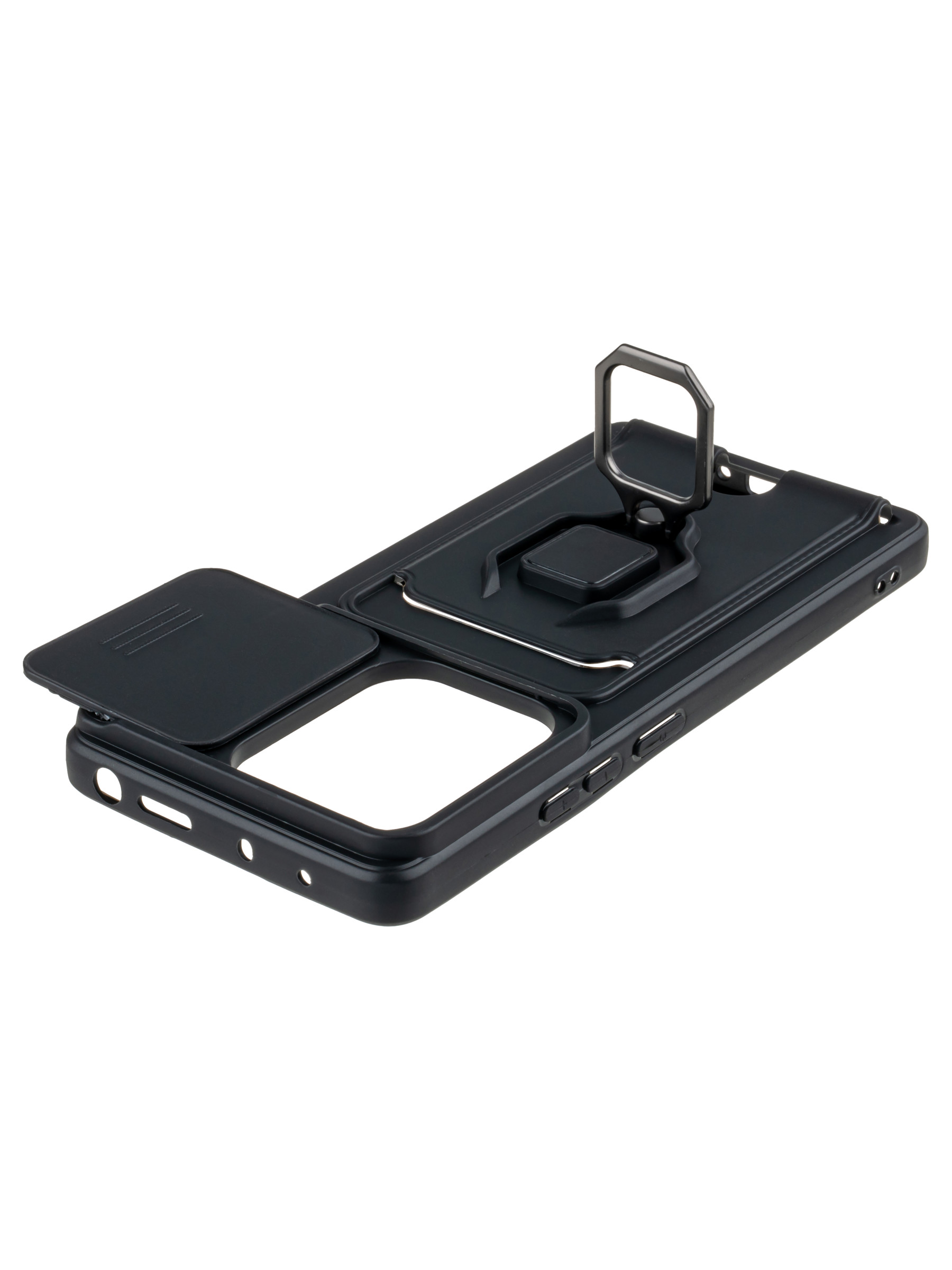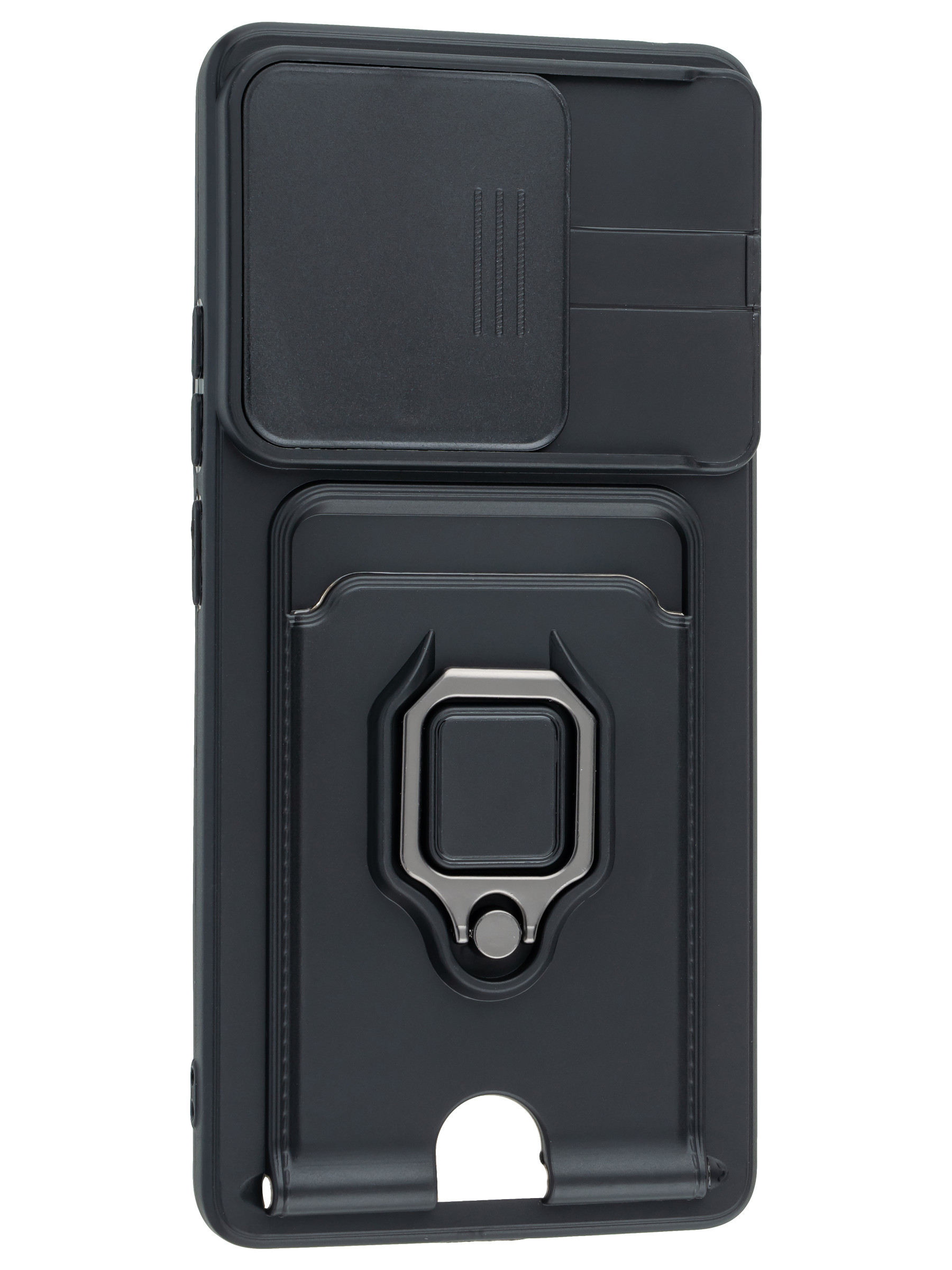 Силиконовый чехол с кольцом держателем из металла, который так же можно использовать к магнитному держателю. Такая конструкция не позволит выронить телефон из рук. Чехол с защитой камеры надежно закрывает её выдвижной шторкой, что защищает её от царапин и других повреждений. Защитный чехол с кармашком для карт - рассчитан исключительно для хранения карт и визиток. Не предусмотрен для бесконтактной оплаты. Чехол накладка идут с закрытым низом, с закрытой камерой и с защитой экрана, немного приподнятые рамки (бортики) над дисплеем телефона, позволят сохранить его без повреждений и царапин, если положить смартфон экраном вниз, а также смягчают удар при падении. Чехол с закрывающейся камерой и с картхолдером идеально подойдет мужчинам, благодаря своему массированному внешнему виду. Матовый чехол с подставкой, которой выступает кольцо держатель, позволяет использовать его в горизонтальном положении для удобного просмотра видеороликов. Встроенное в чехол отделение для карты позволяет поместить внутрь банковскую карту, проездной или пропуск, присутствует удобный вырез для установки и извлечения карты.