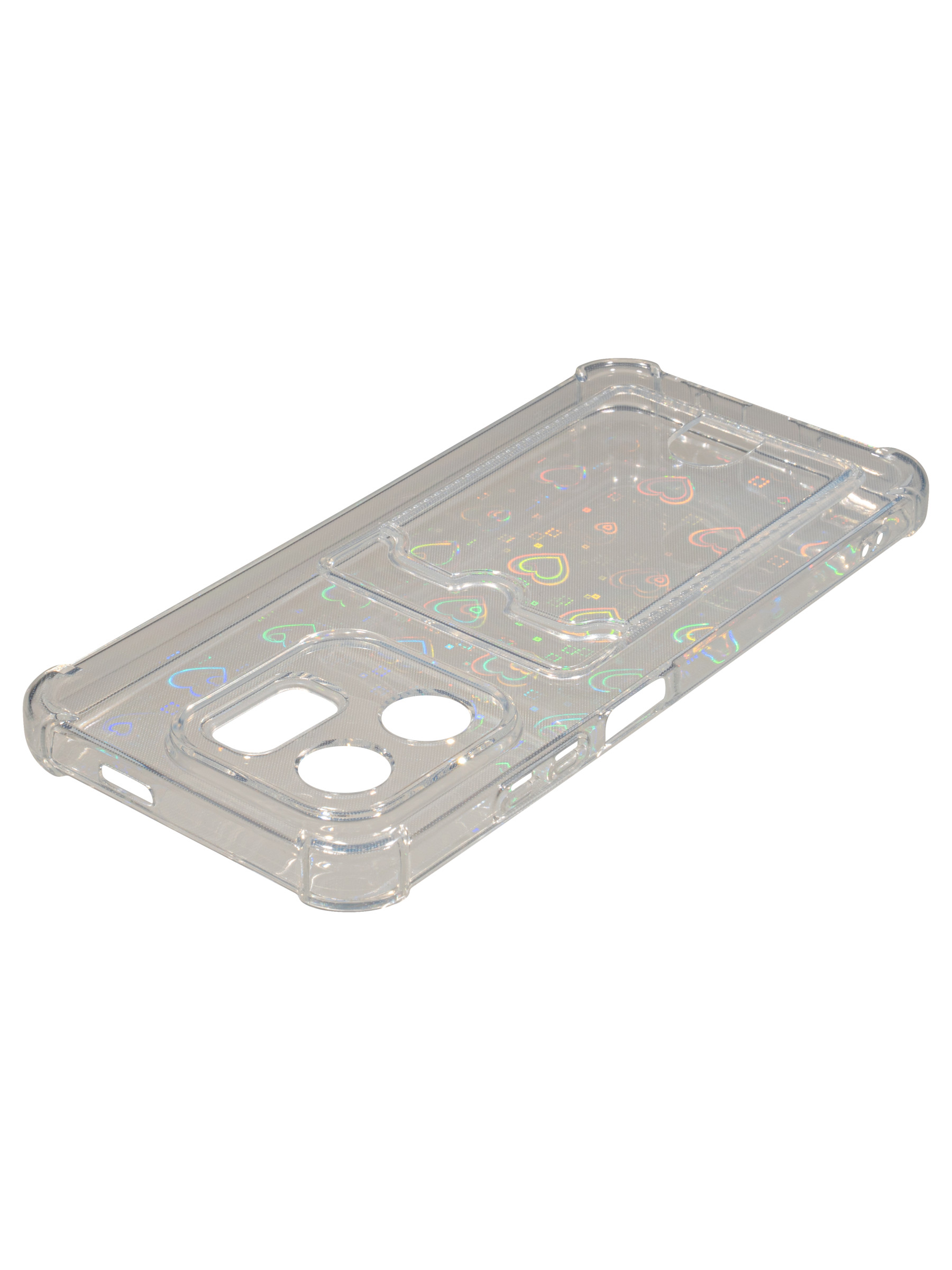 Противоударный силиконовый чехол со съемной мерцающей подложкой и кармашком. Рассчитан исключительно для хранения карт и визиток. Не предусмотрен для бесконтактной оплаты. Все вырезы идеально подогнаны.Серия White heart.