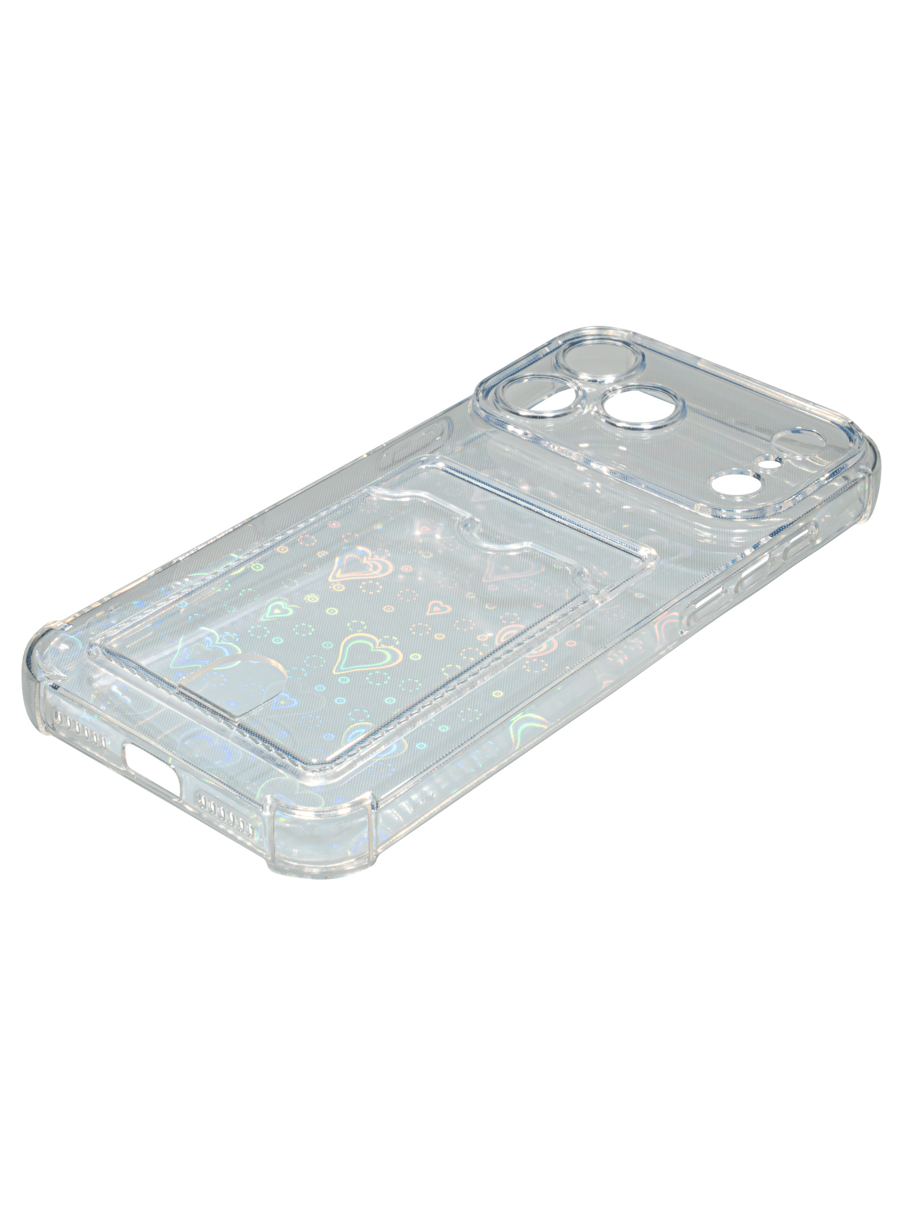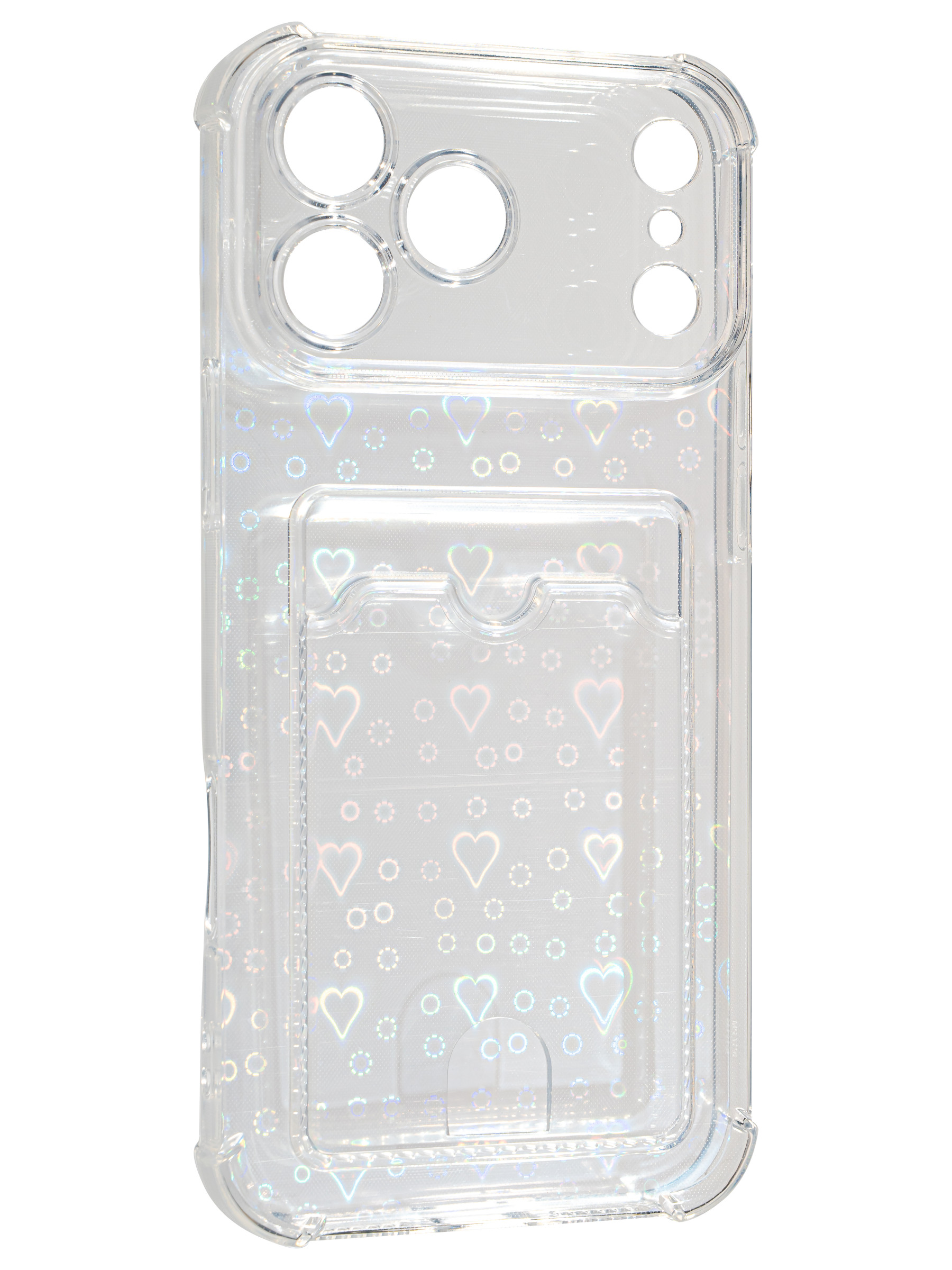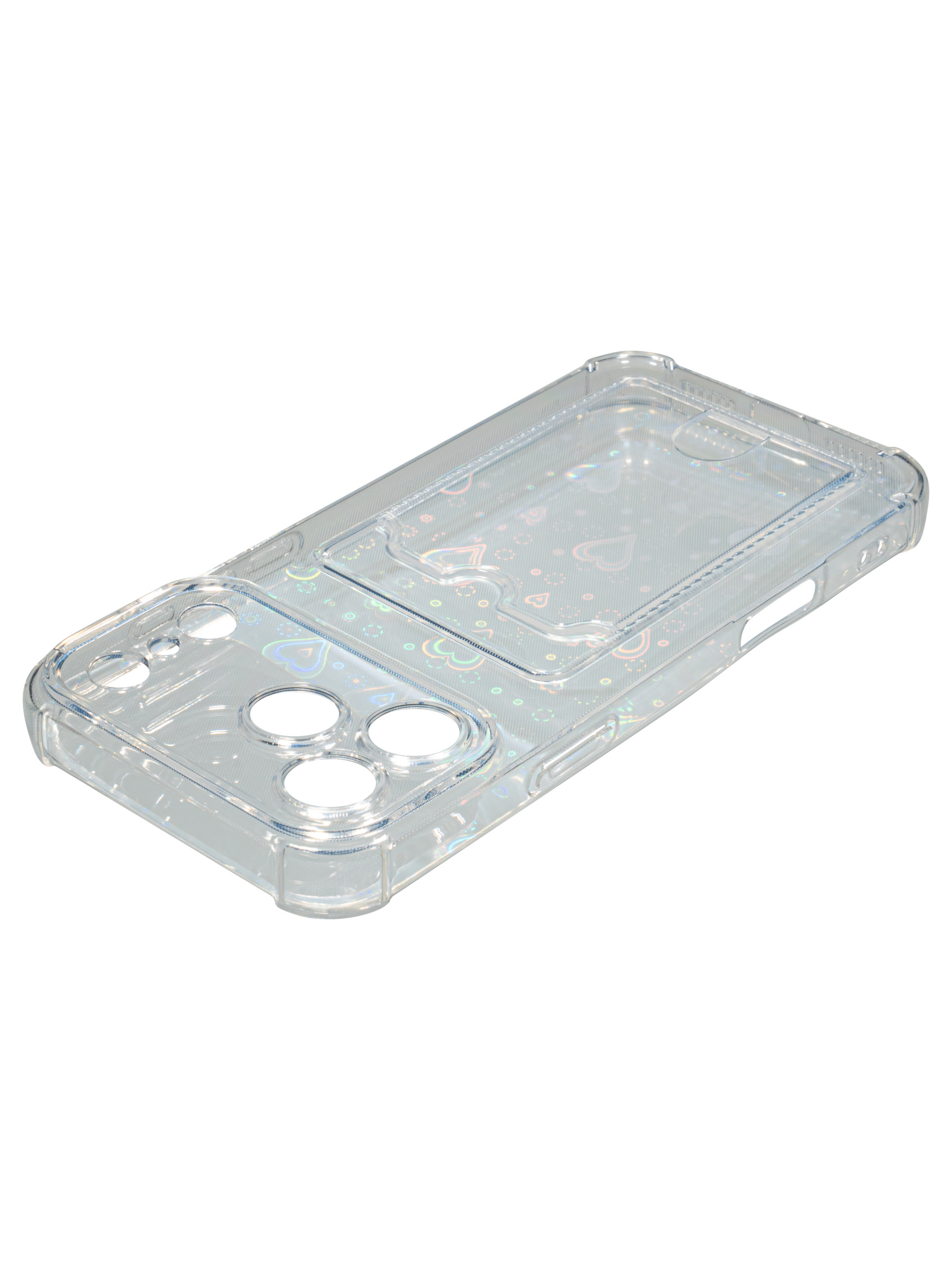 Противоударный силиконовый чехол со съемной мерцающей подложкой и кармашком. Рассчитан исключительно для хранения карт и визиток. Не предусмотрен для бесконтактной оплаты. Все вырезы идеально подогнаны.Серия White heart.