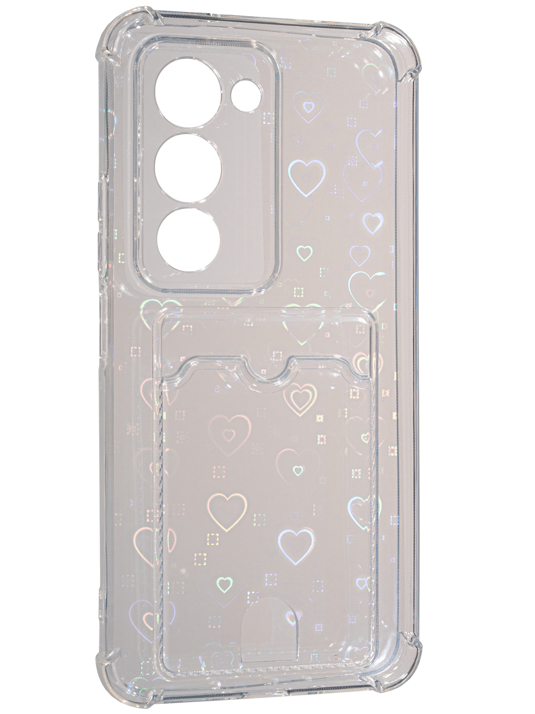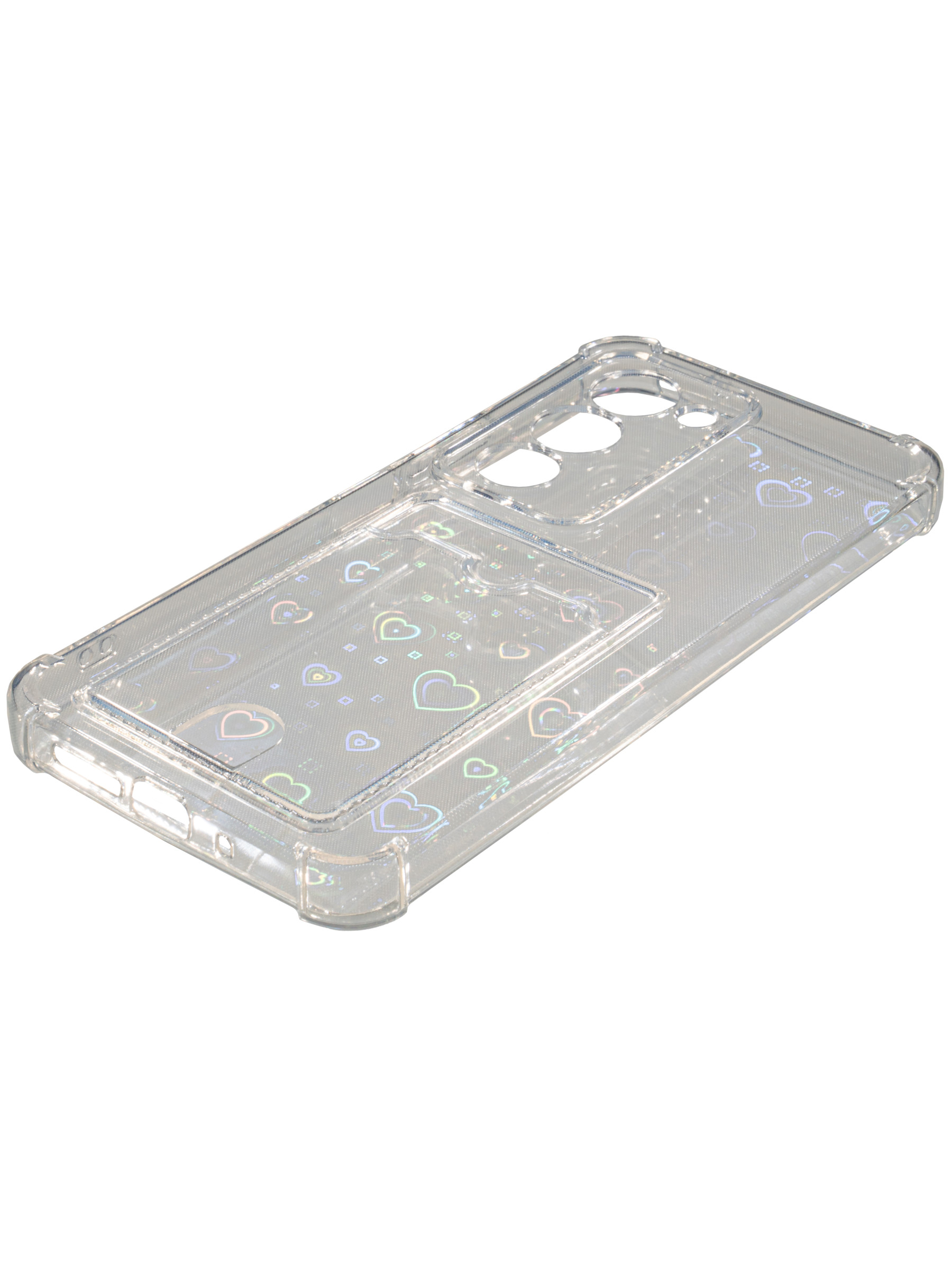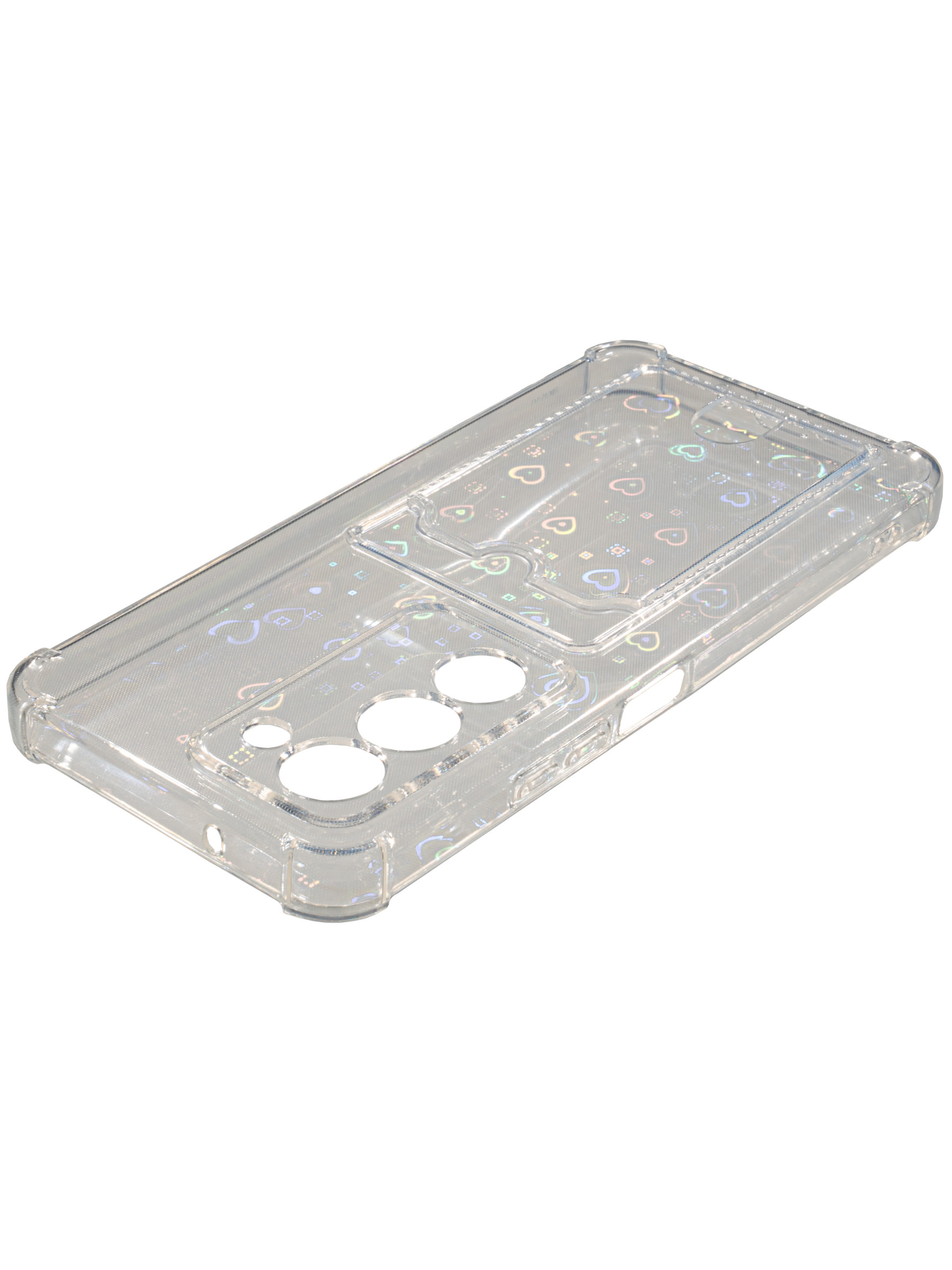 Противоударный силиконовый чехол со съемной мерцающей подложкой и кармашком. Рассчитан исключительно для хранения карт и визиток. Не предусмотрен для бесконтактной оплаты. Все вырезы идеально подогнаны.Серия White heart.