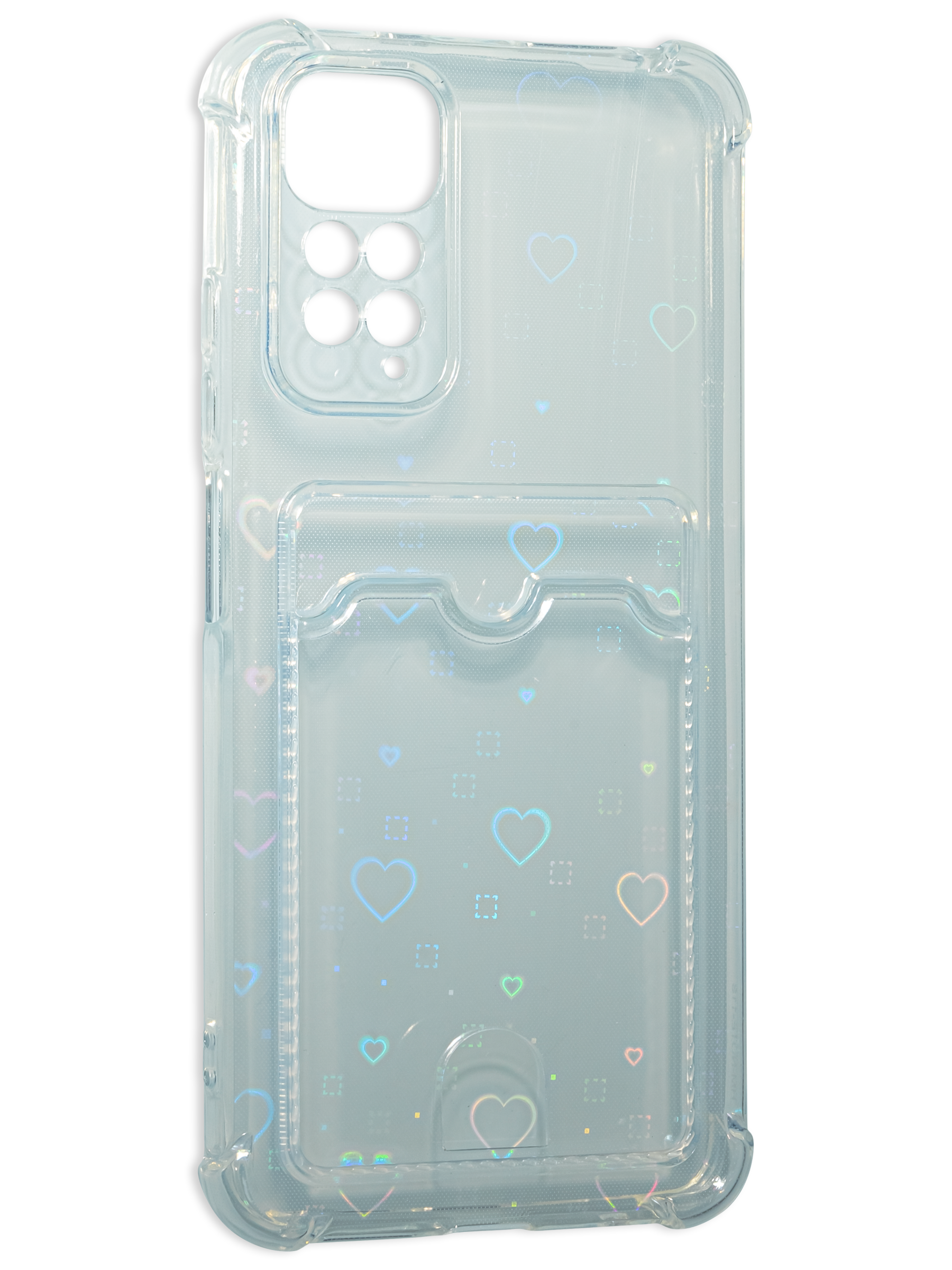 Противоударный силиконовый чехол со съемной мерцающей подложкой и кармашком. Рассчитан исключительно для хранения карт и визиток. Не предусмотрен для бесконтактной оплаты. Все вырезы идеально подогнаны.Серия White heart.